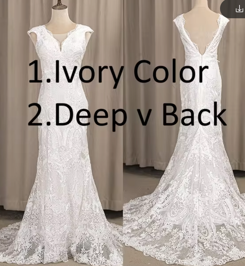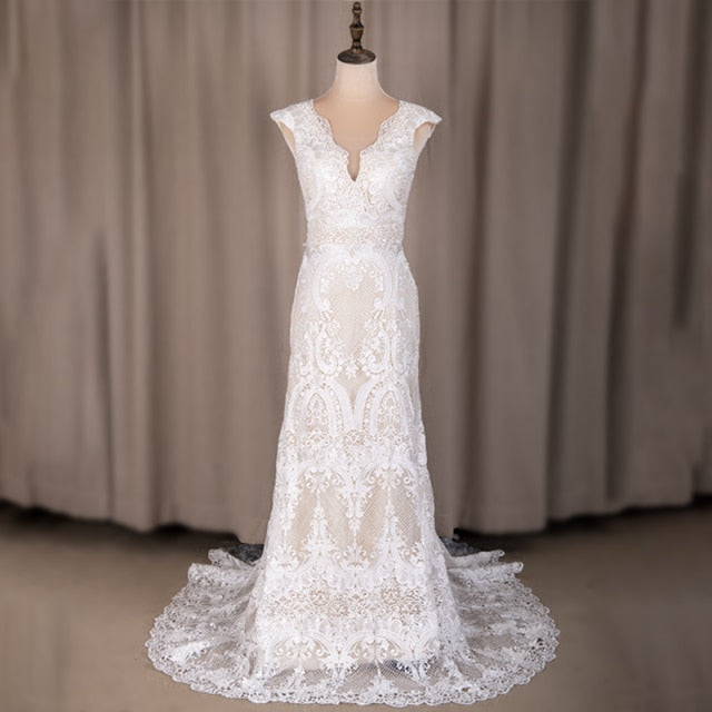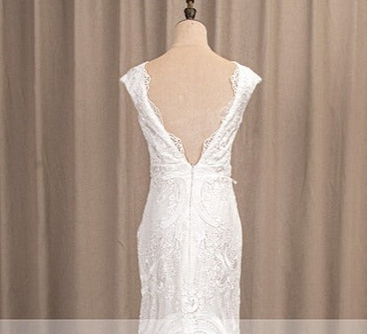 Boho Wedding Dress Deep V-Neck Lace Sheath Bridal Gown, Experience an unforgettable wedding day with our stunning deep V-neck lace sheath bridal dress! This dress showcases a full lace design with a lining, short cap sleeves, a deep V back, and a breathtaking lace sweep train.