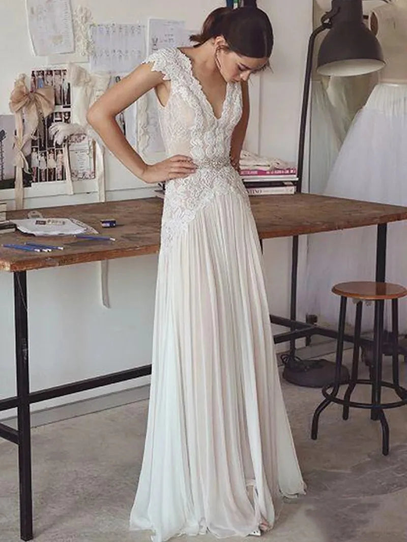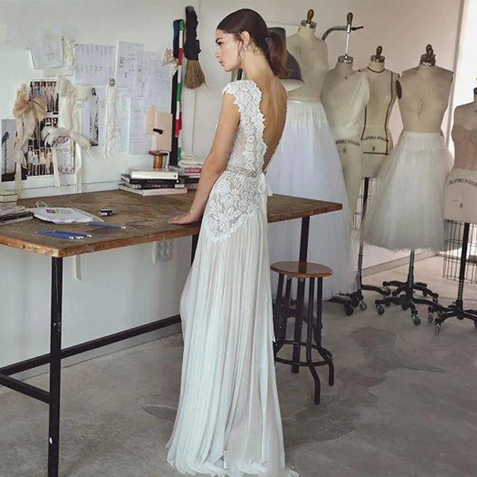 Boho Wedding Dress With A Line Open V Back, This boho lace wedding dress simplifies your beach destination wedding with an easy to pack lace dress with pleated skirt and boho dress design, a pure beauty to wear with an open V front and deep V open back adorned with short cap shoulder sleeve, a slim fitted A line boho dress.