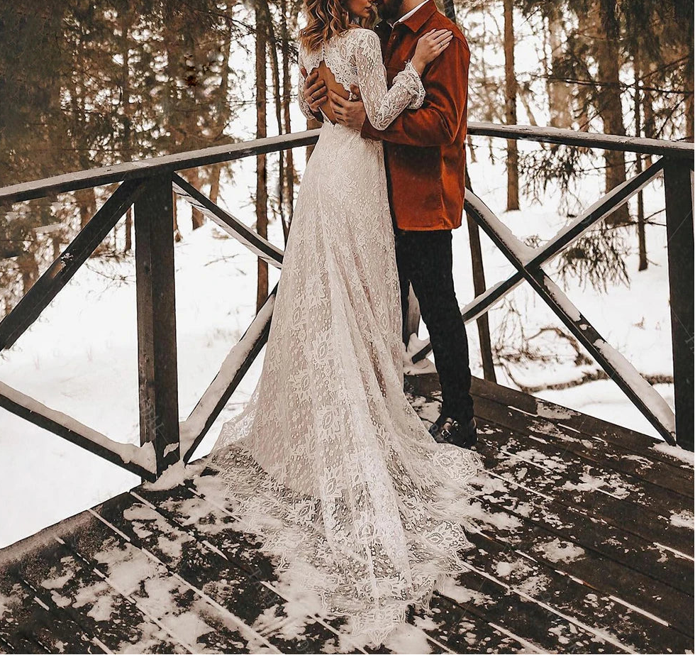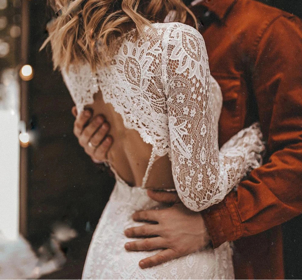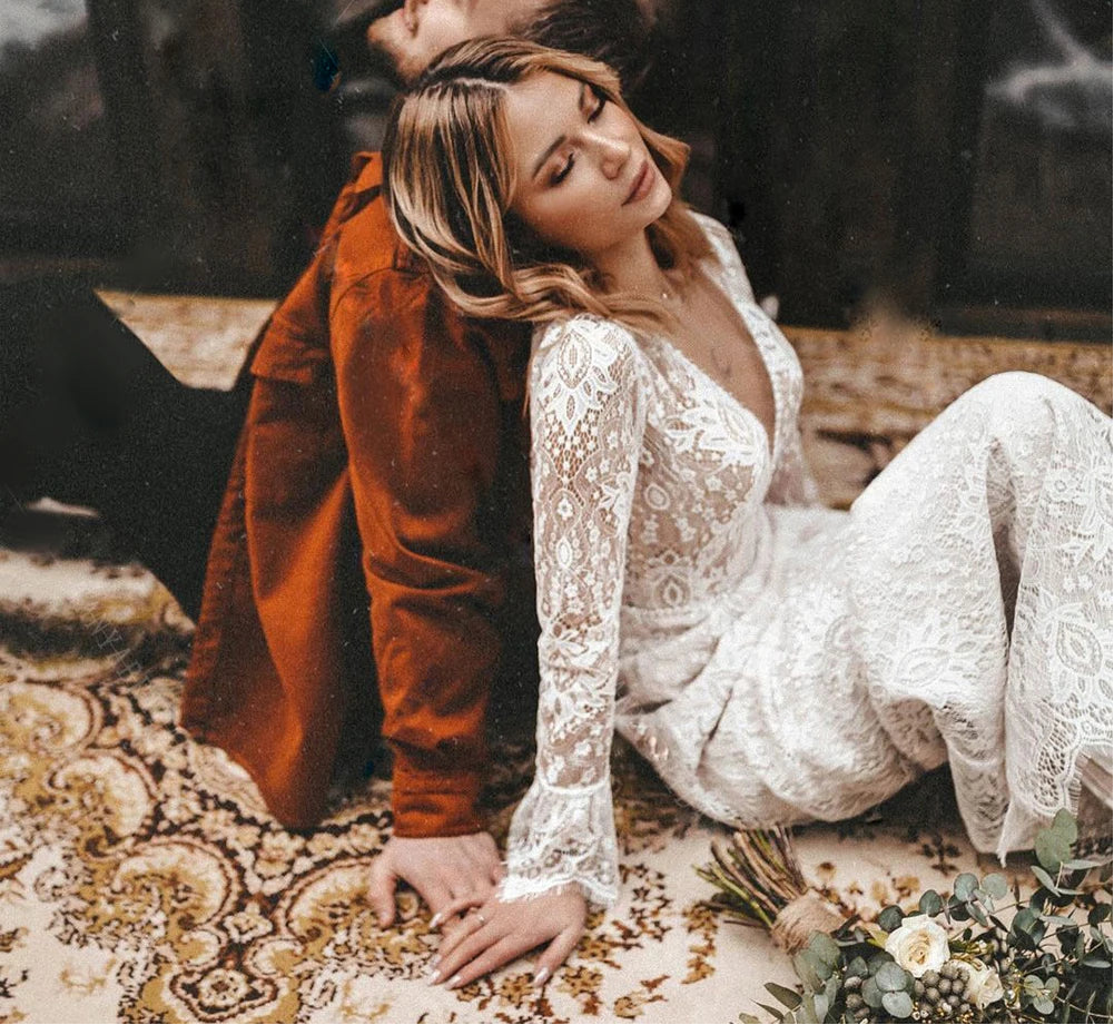 Lace Boho Wedding Dress Deep V Neck Open Back Long Sleeve Bridal Gown