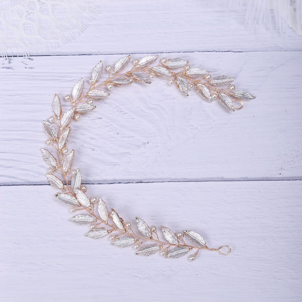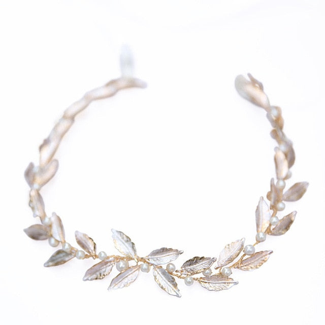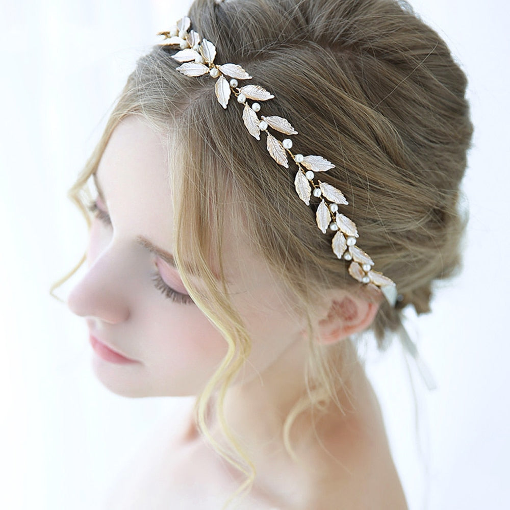 Bridal Headpiece Pearl Wedding Headband Tiara Accessory, Experience the perfect blend of minimalist design and vintage elegance with this bridal headband, adorned with delicate pearls and intricate gold leaves. Perfect for a boho or summer wedding, this hair ornament adds a touch of sophistication and charm to any bridal look.