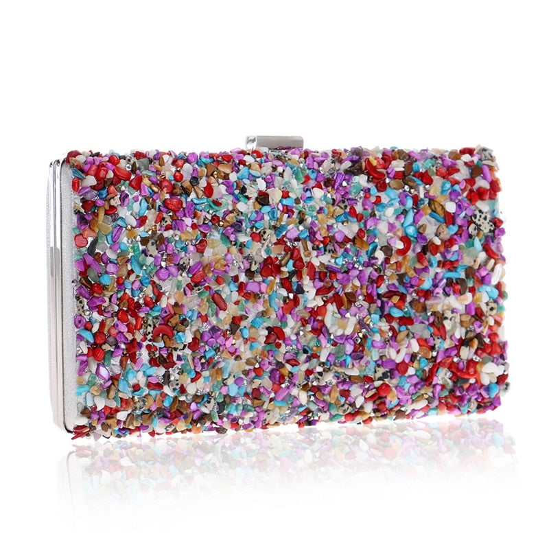 Crystal Clutch Purse Boho Rhinestone Evening Bag Small Day Clutch, Colorful as candy, this small bohemian style clutch features a center hasp closure with hard shell exterior and lined interior, 8.5 inch length, 2 inch wide, 4.5 inch height.