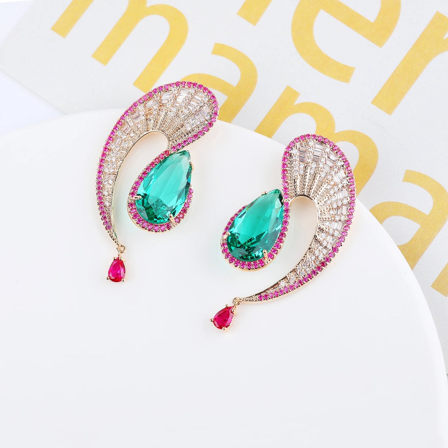 Cubic Zirconia Crystal Earrings Gemstone Jewelry For Women Accessory, Add a touch of glamour to any occasion with these Cubic Zirconia Jewelry Earrings. These fashion-forward earrings feature a large teardrop CZ crystal, intricately surrounded by a wave of sparkling crystals. Complete with a dangling CZ crystal, these earrings will surely dazzle as you make your grand entrance. Perfect for weddings, parties, and formal events.
