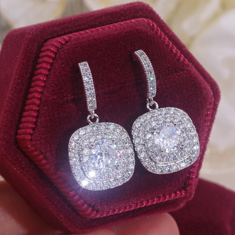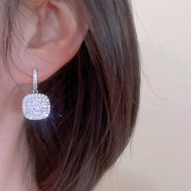 Cubic Zirconia Wedding Earrings Crystal Bridal Jewelry Accessory, luxurious micro pave cubic zirconia crystal earrings featuring a fine cut center crystal with micro pave inlaid around it in a square shape and inlaid micro pave earring accented drop.