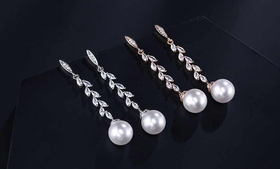 Long Pearl Crystal Bridal Earrings Cubic Zirconia Jewelry Accessory