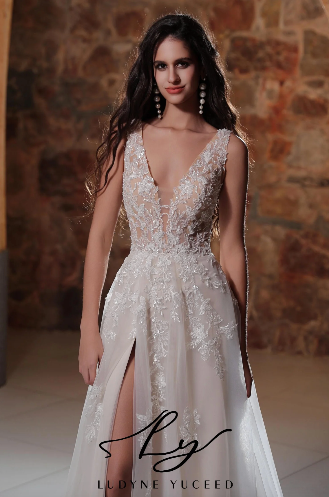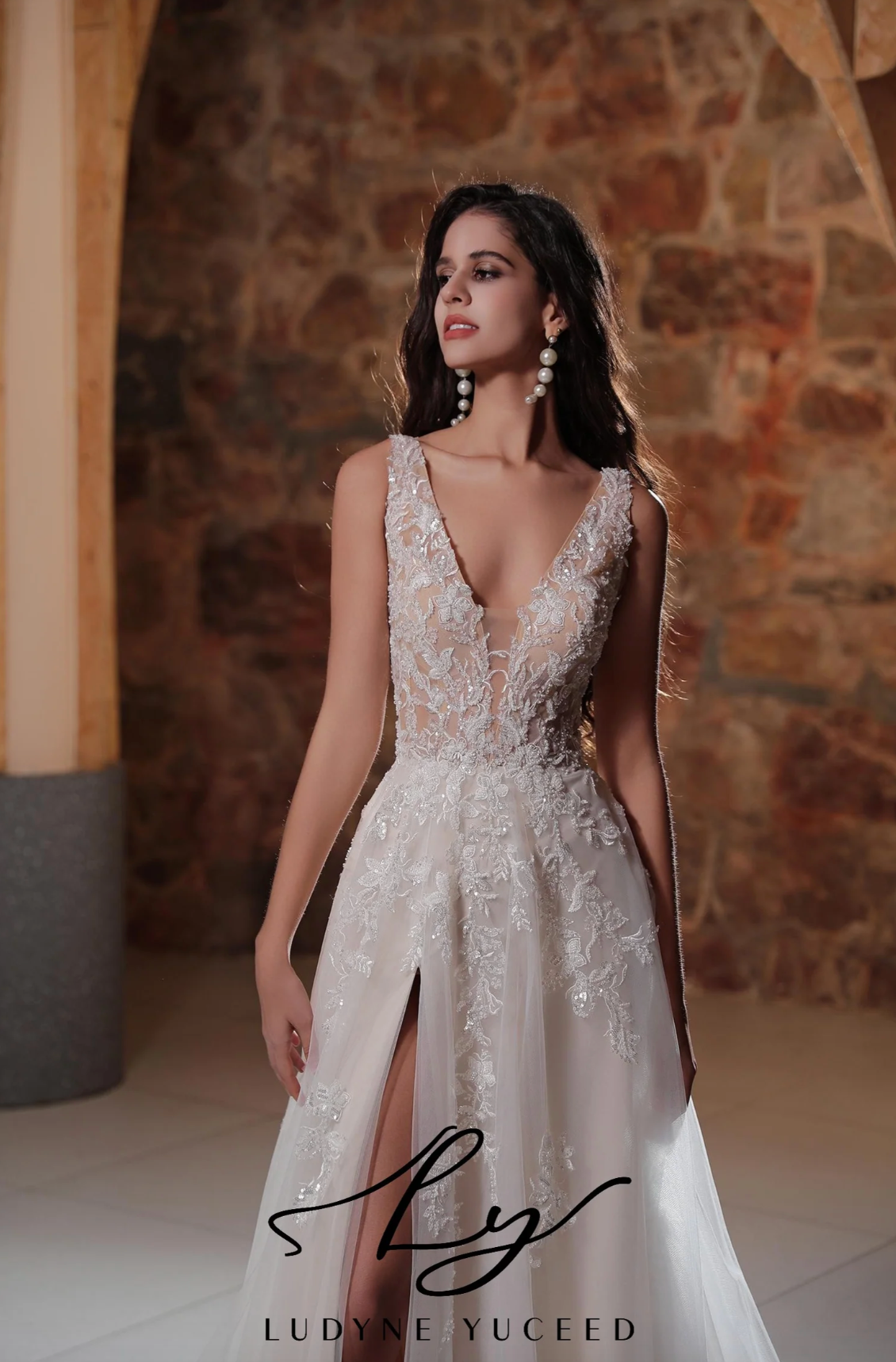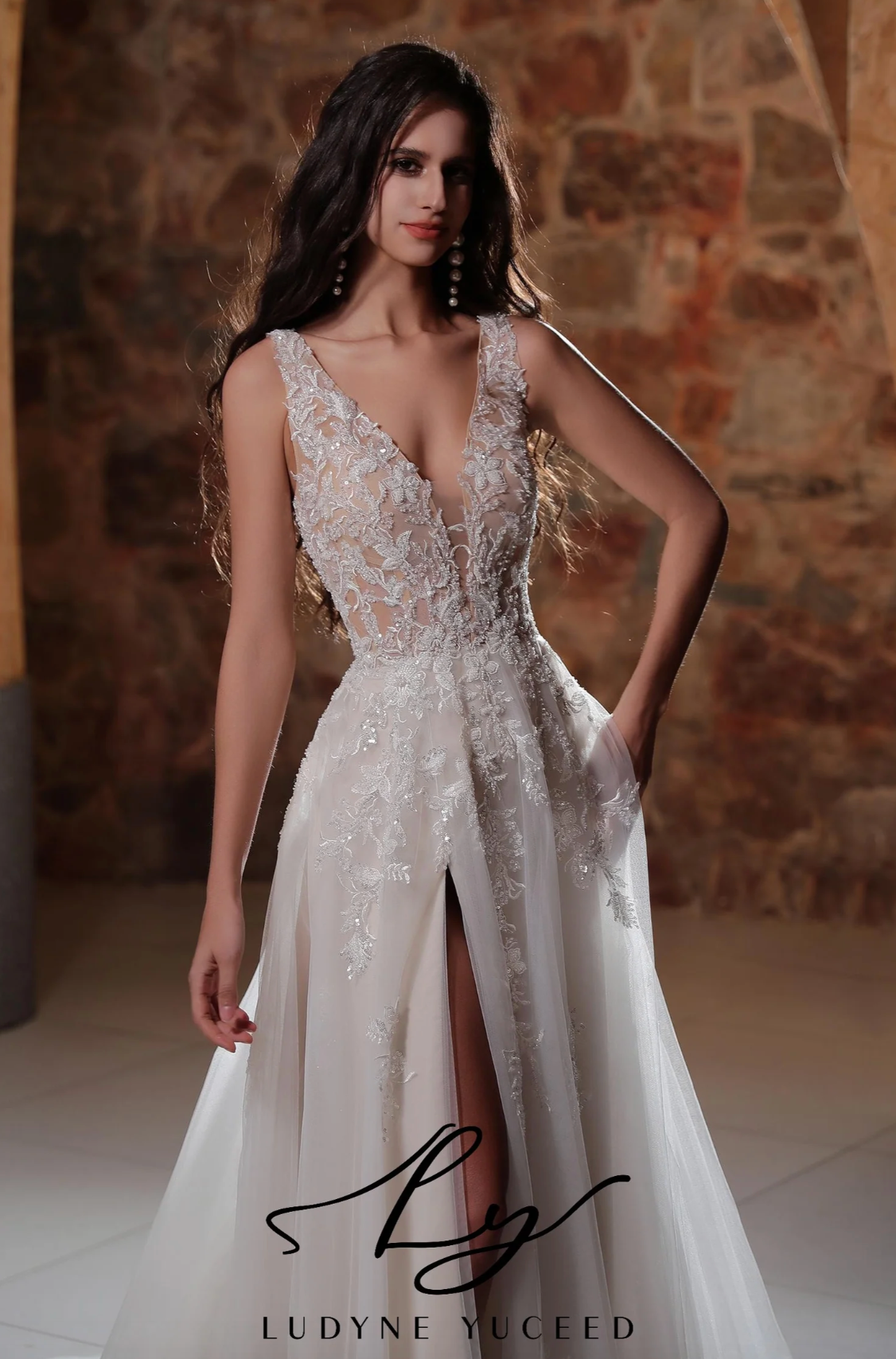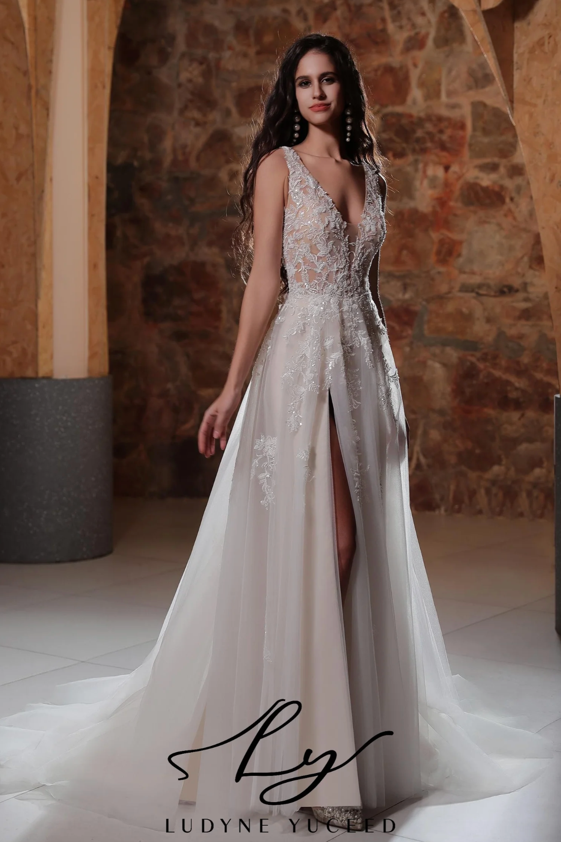 Wedding Dress Plunging V-Neckline Tulle A-Line Bridal Gown, This wedding gown showcases exquisite craftsmanship with a bodice embellished in intricate lace appliqués that flow seamlessly into a fitted waist. The design features a plunging neckline and a thigh-high slit that elegantly reveals the arms and legs, beautifully accentuating the bride’s silhouette with a refined allure.