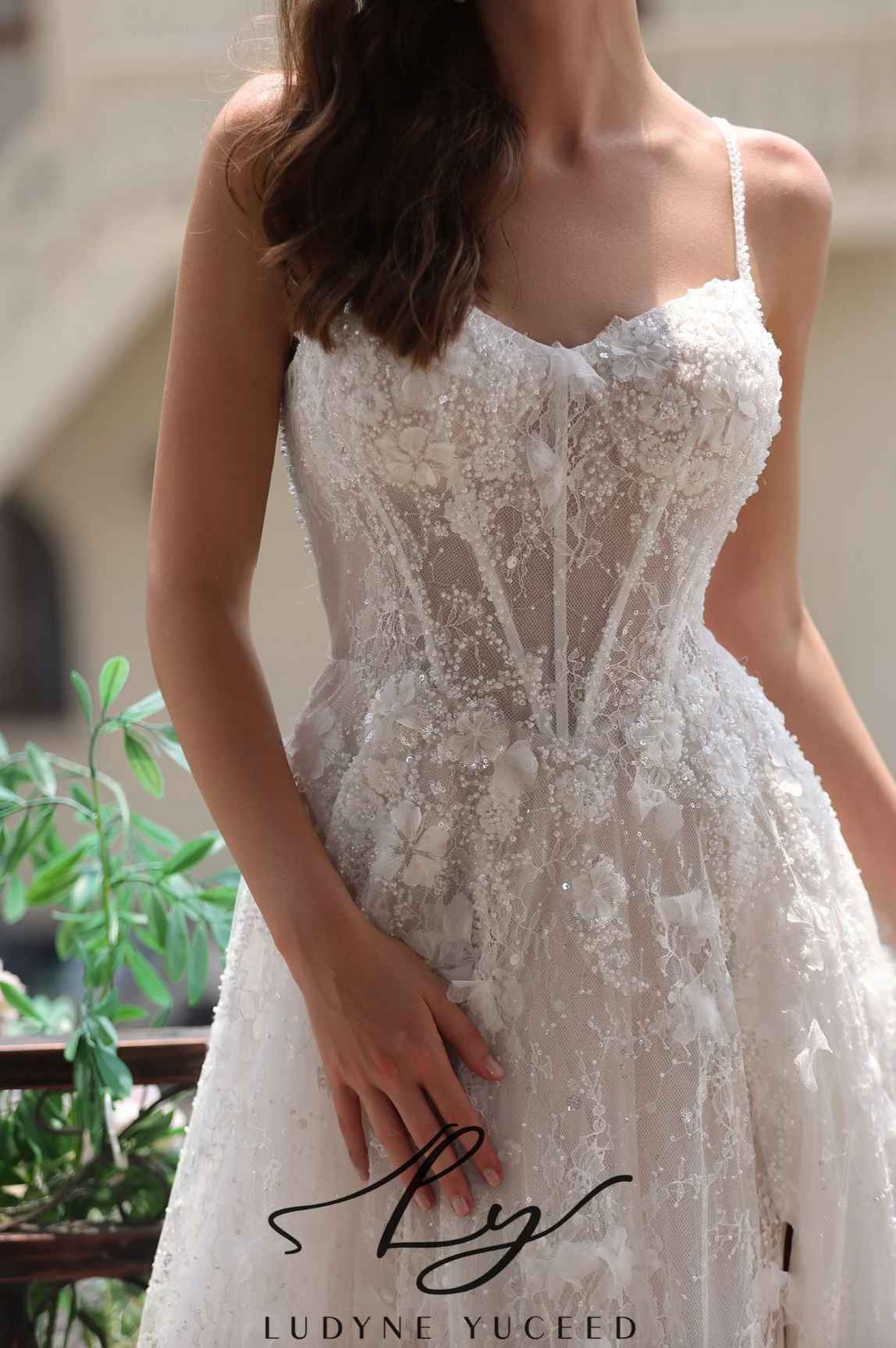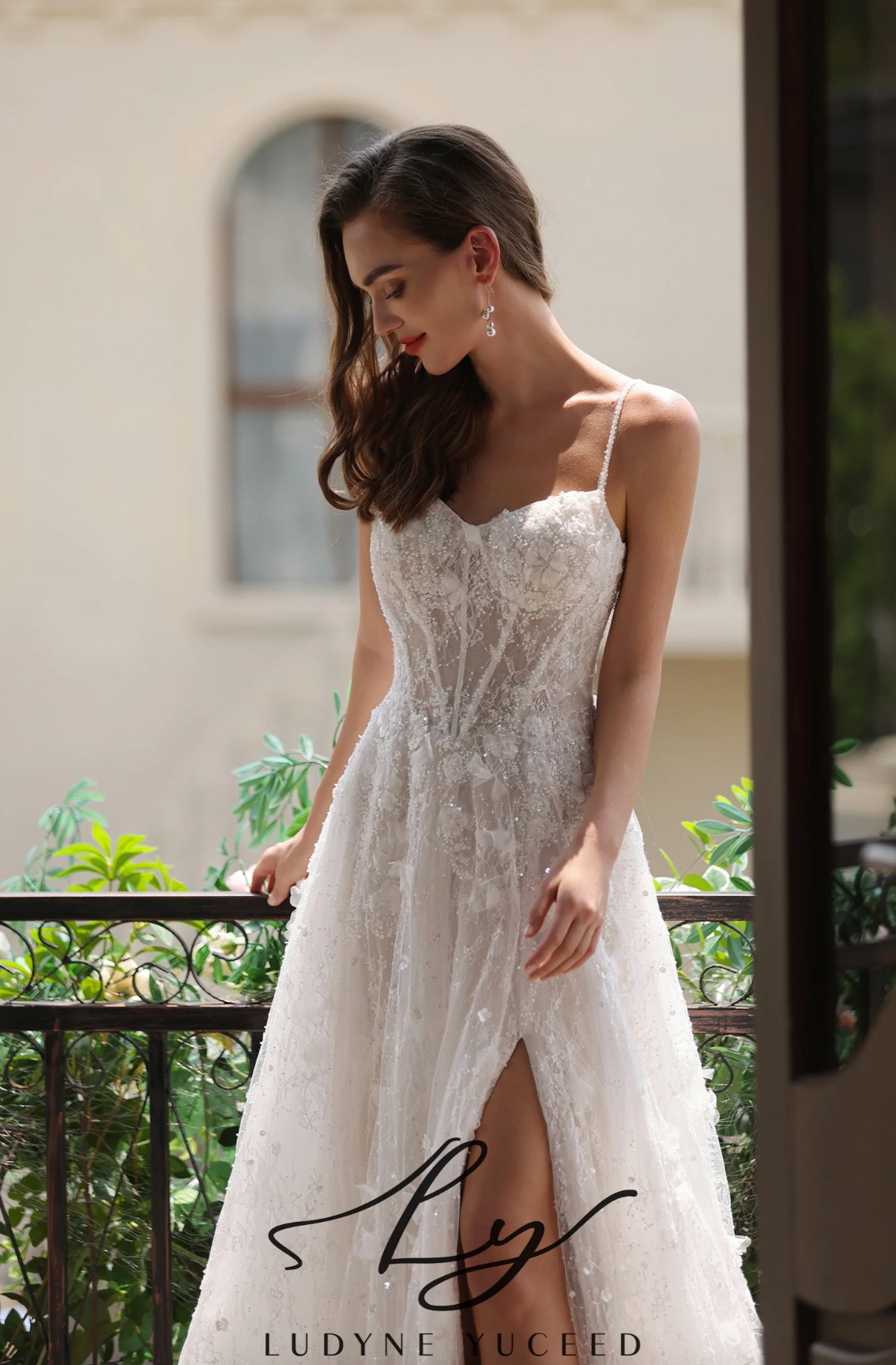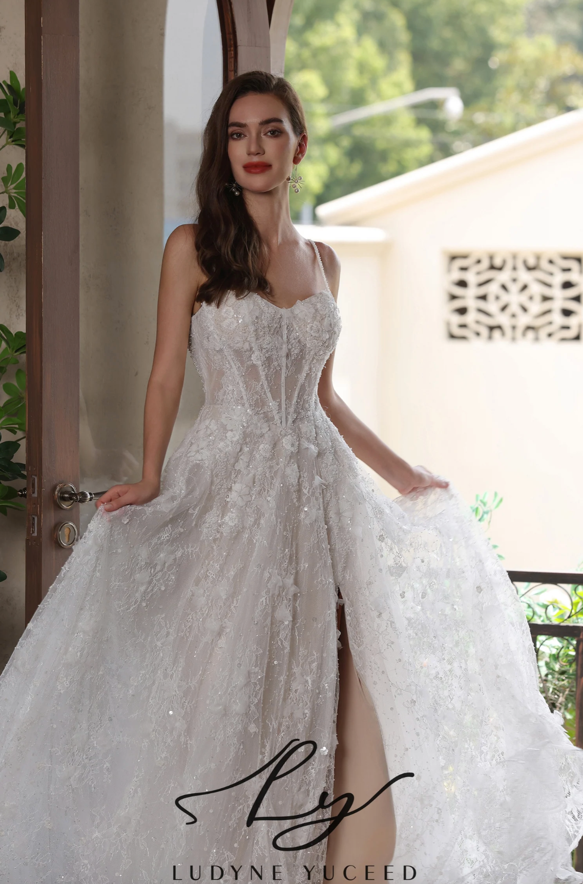 Wedding Dress Sparkle Tulle Floral Lace With Train Bridal Gown, combines timeless elegance with contemporary charm. Delicate spaghetti straps frame a sweetheart neckline, while intricate floral lace embellishes the bodice and flowing tulle skirt. A striking high slit adds a modern edge, perfectly balanced by the gown’s graceful train. Designed for brides seeking a sophisticated yet ethereal look, this gown promises to make every moment down the aisle unforgettable.