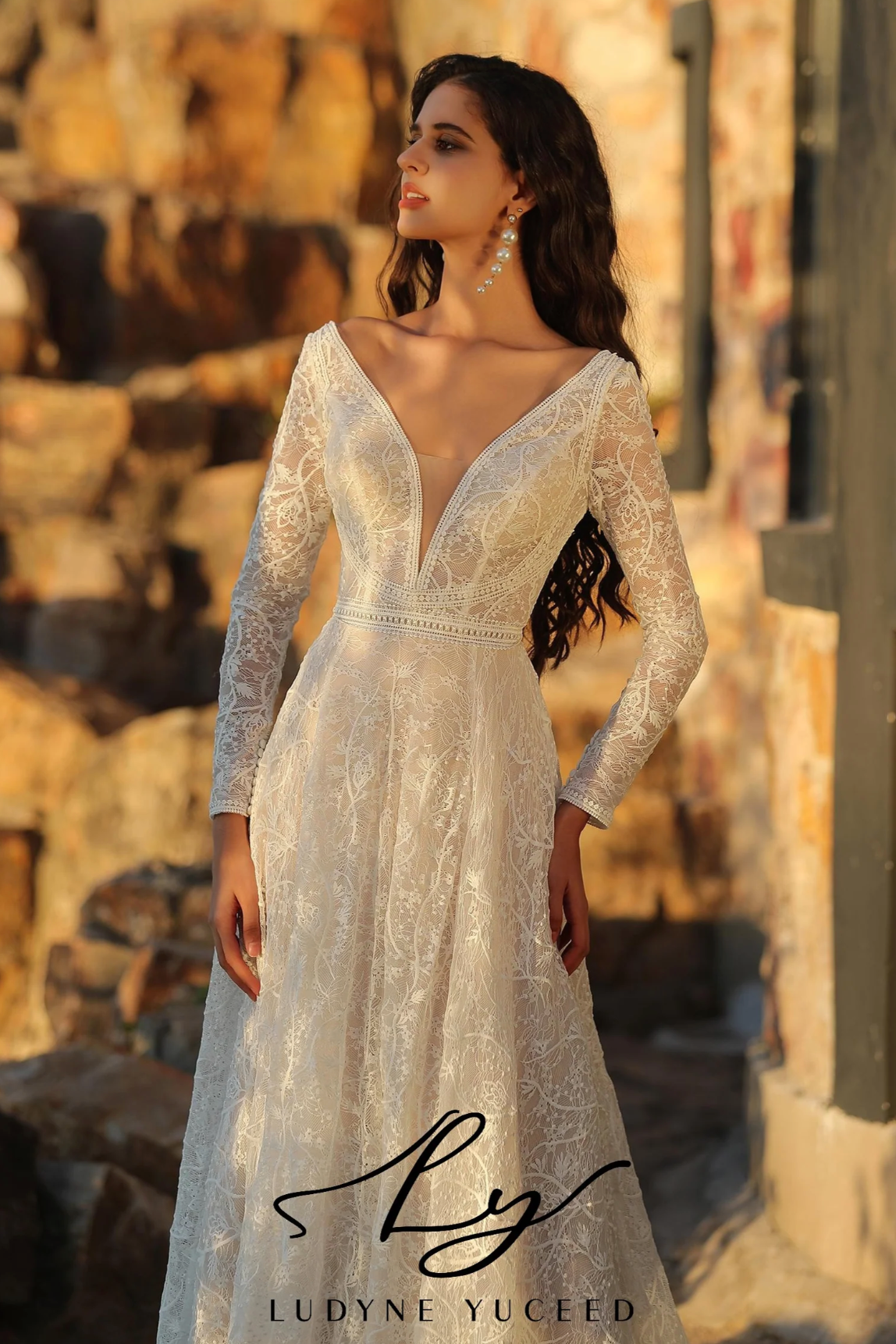 Wedding Dress Boho A-Line V Neck Lace Long Sleeve Bridal Gown