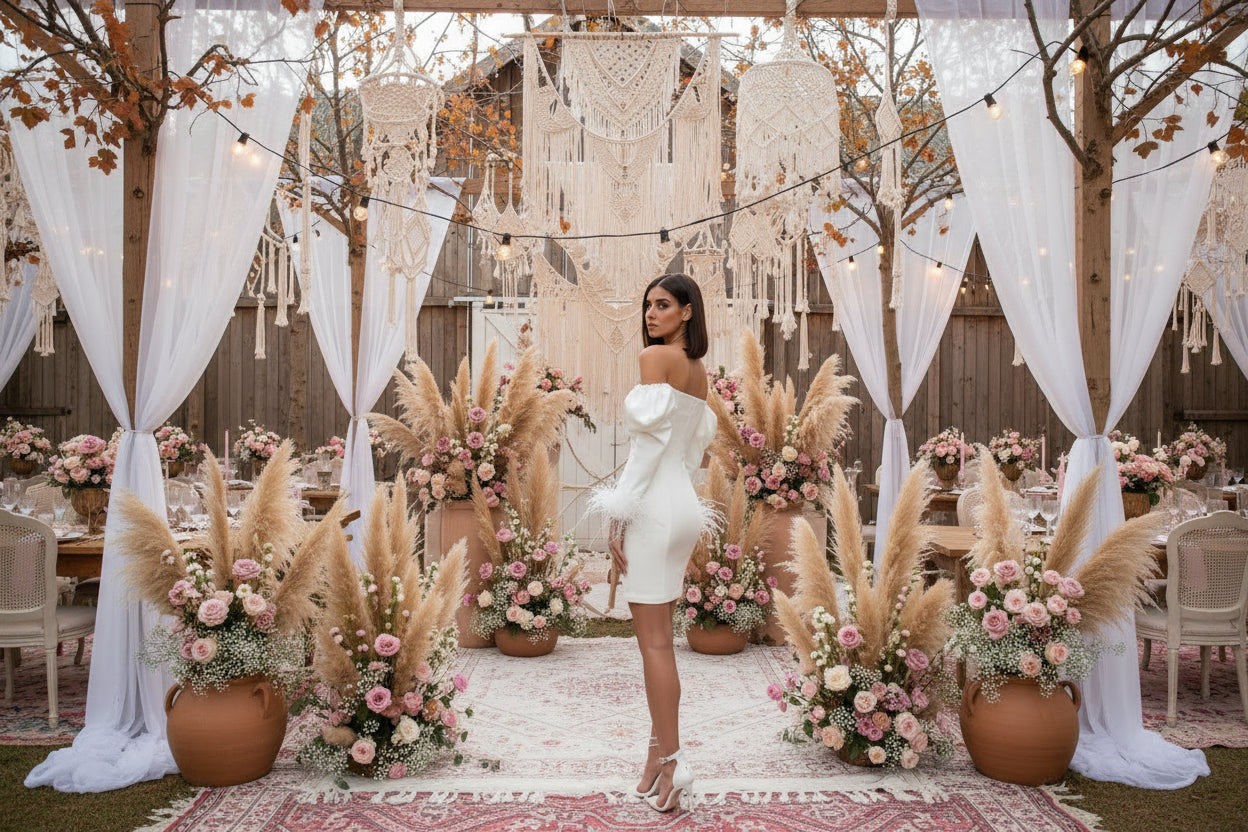 Feather Mini Wedding Dress Long Sleeve Boat Neck Bridal Gown, turn heads at your reception in this cheeky mini wedding dress designed for the modern, cosmopolitan bride who refuses to play it safe. Featuring dramatic shoulder puff long sleeves, a sleek boat neckline, and show-stopping feather wrist cuffs, this above-the-knee stunner brings serious personality to your big day. The convenient zipper back closure makes getting ready effortless, so you can focus on celebrating. Perfect for brides ready to dance, twirl, and own every moment of their wedding.
