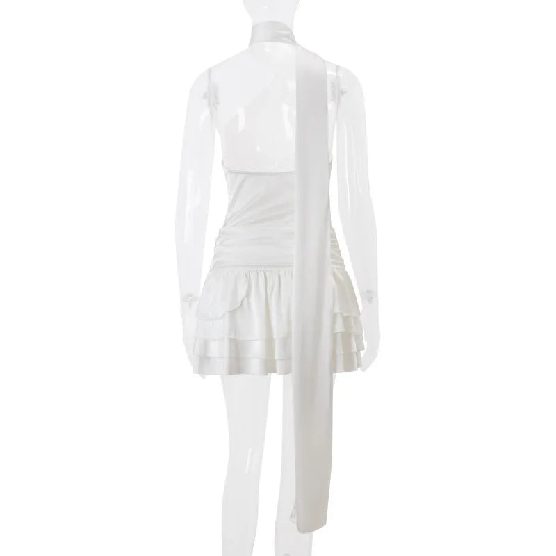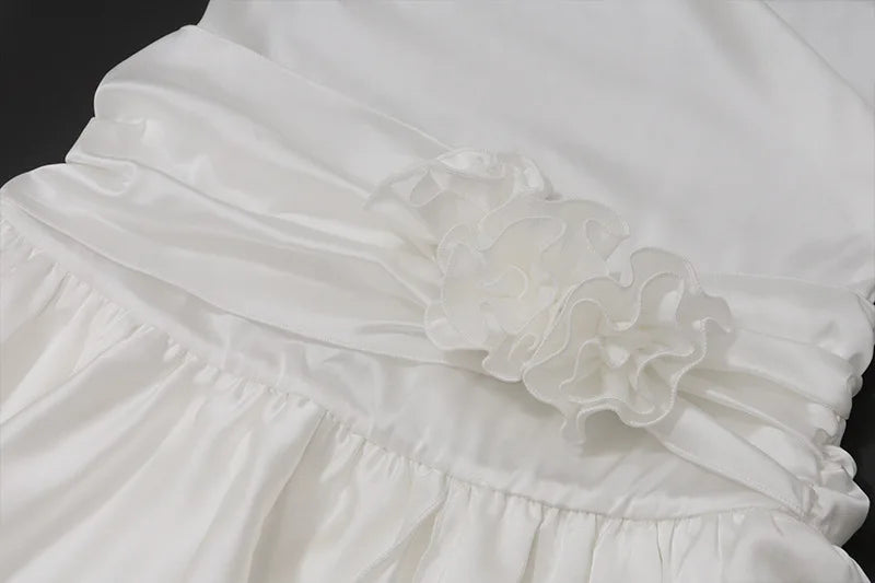 Discover timeless elegance with our Mini Wedding Dress Backless 3D Flowers White Halter A-line. Showcasing a graceful off-one-shoulder tie sash, an open back, and a flirty mini ruffle skirt above the knee, this dress is completed with a delicate rosette waist sash. Ideal for any event, it combines sophistication and confidence in one stunning piece.