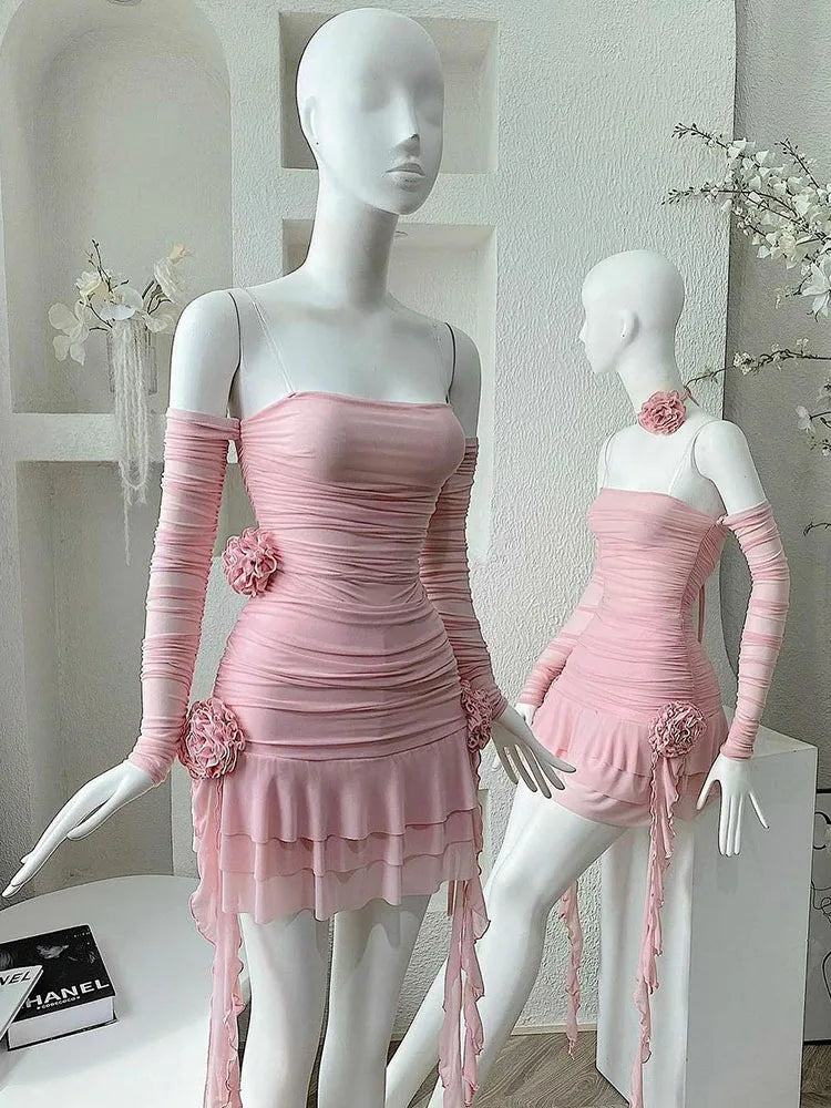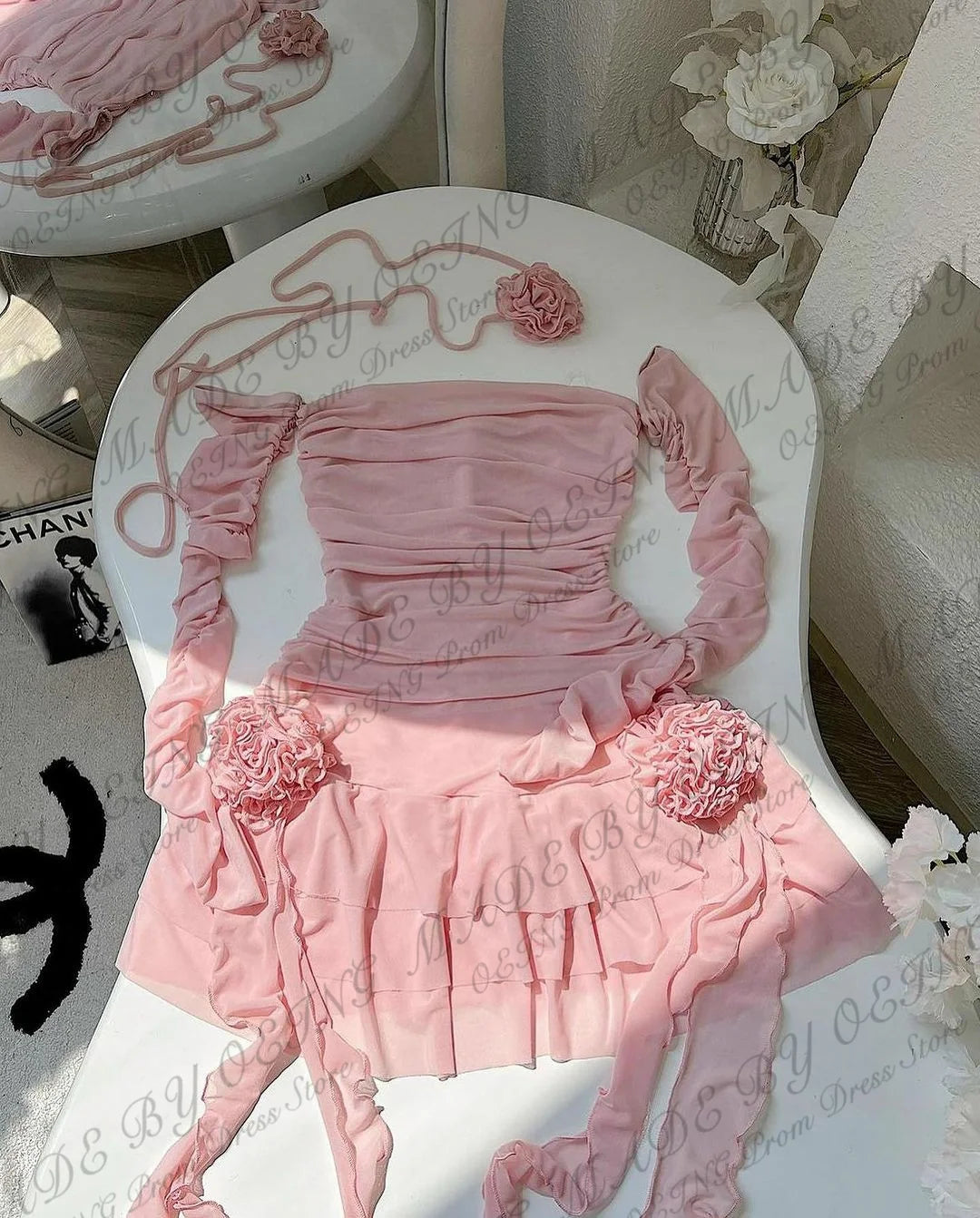 Mini Wedding Dress Short Chiffon Bridal Gown, Make a stylish entrance in this Mini Wedding Dress Short Chiffon Bridal Gown. This sophisticated chiffon gown showcases graceful ruffles and a flattering ruched silhouette. Featuring matching long sleeves and an off-the-shoulder neckline embellished with floral accents, this slim-fitting dress is an elegant choice for any special occasion or event. Prepare to capture attention and leave a lasting impression in this exquisite evening dress.