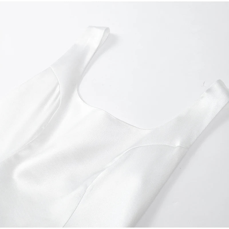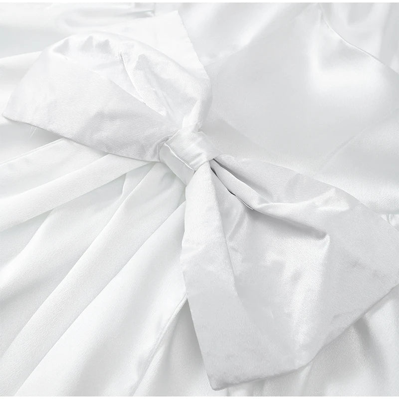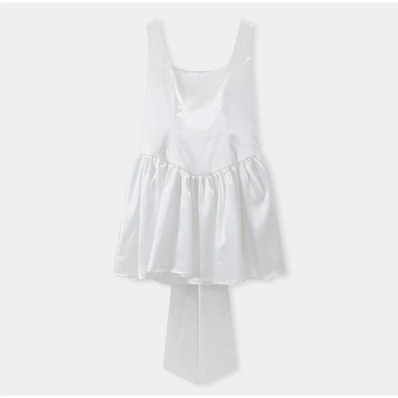 Mini Wedding Dress Short Skirt Pleated Chic Bow Backless , Elevate your style with this sophisticated white mini dress crafted from a luxurious poly satin blend. Featuring a chic pleated skirt that falls above the knee, a playful scoop neckline, and an eye-catching oversized bow at the back, this dress balances elegance with a touch of flair. The backless design and side zipper ensure a flawless fit, making it a perfect choice for confident, stylish occasions.