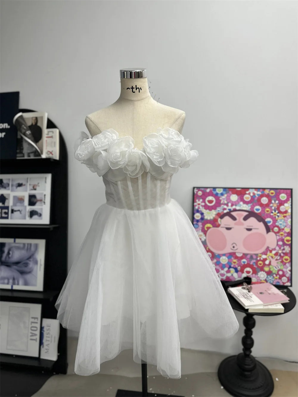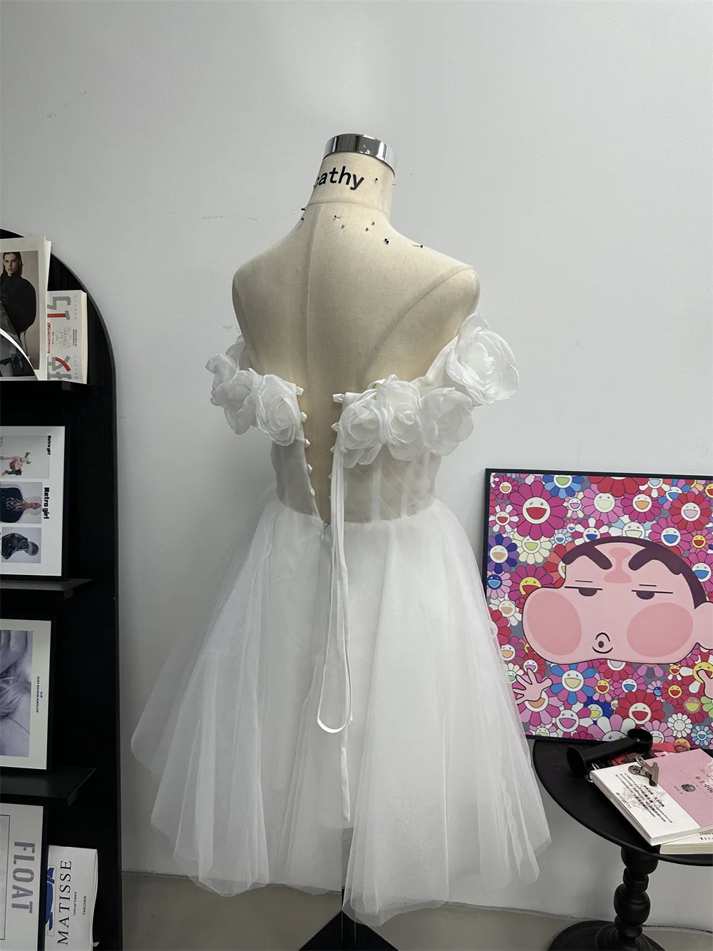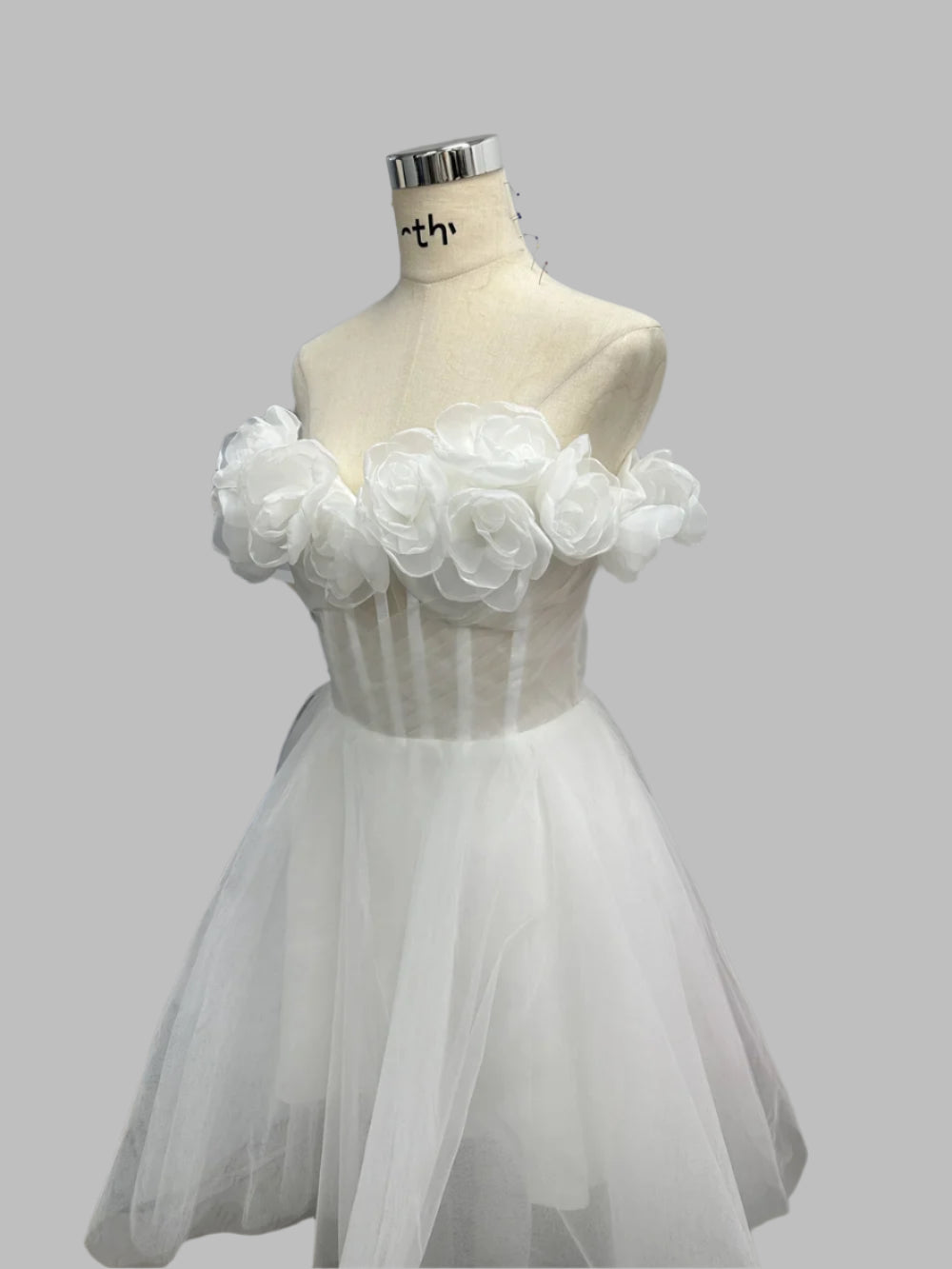 White Mini Off the Shoulder Wedding Dress,  Enhance your special occasions and weddings with our White Mini Off-the-Shoulder Wedding Dress. Featuring an A-line silhouette crafted from delicate tulle, this dress combines femininity with elegance. The corset bodice and floral-embellished off-the-shoulder sleeves bring a romantic charm, while the sweetheart neckline and lace-up back provide an adjustable and comfortable fit.