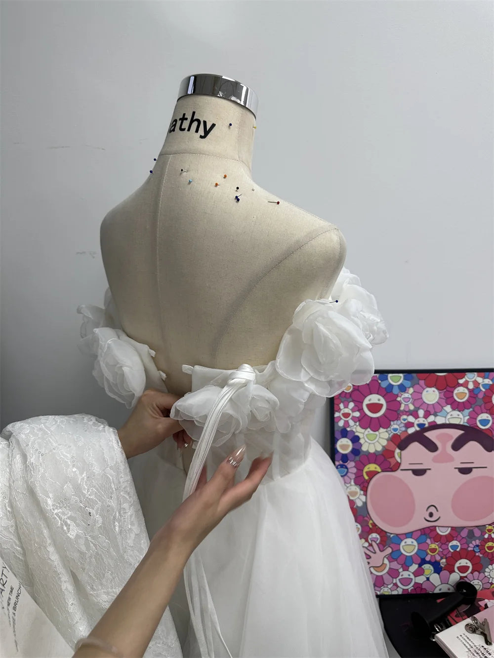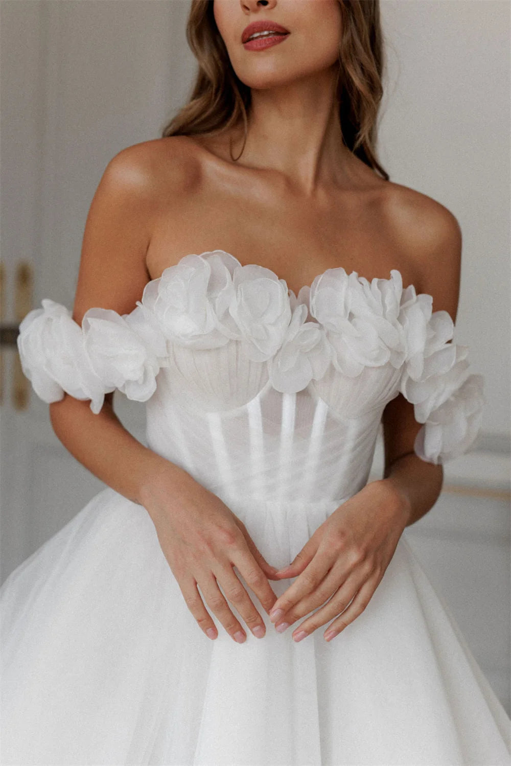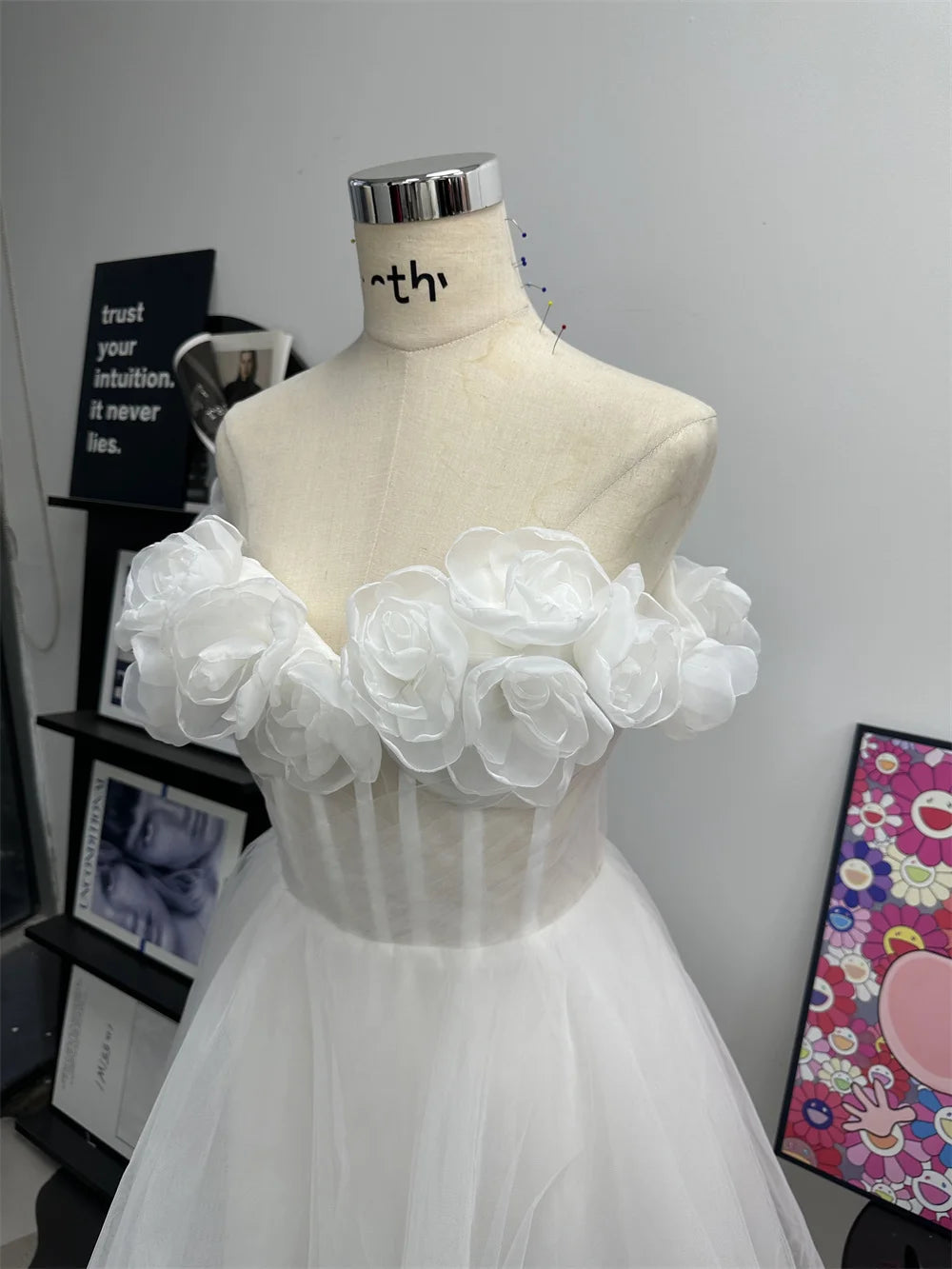 White Mini Off the Shoulder Wedding Dress,  Enhance your special occasions and weddings with our White Mini Off-the-Shoulder Wedding Dress. Featuring an A-line silhouette crafted from delicate tulle, this dress combines femininity with elegance. The corset bodice and floral-embellished off-the-shoulder sleeves bring a romantic charm, while the sweetheart neckline and lace-up back provide an adjustable and comfortable fit.