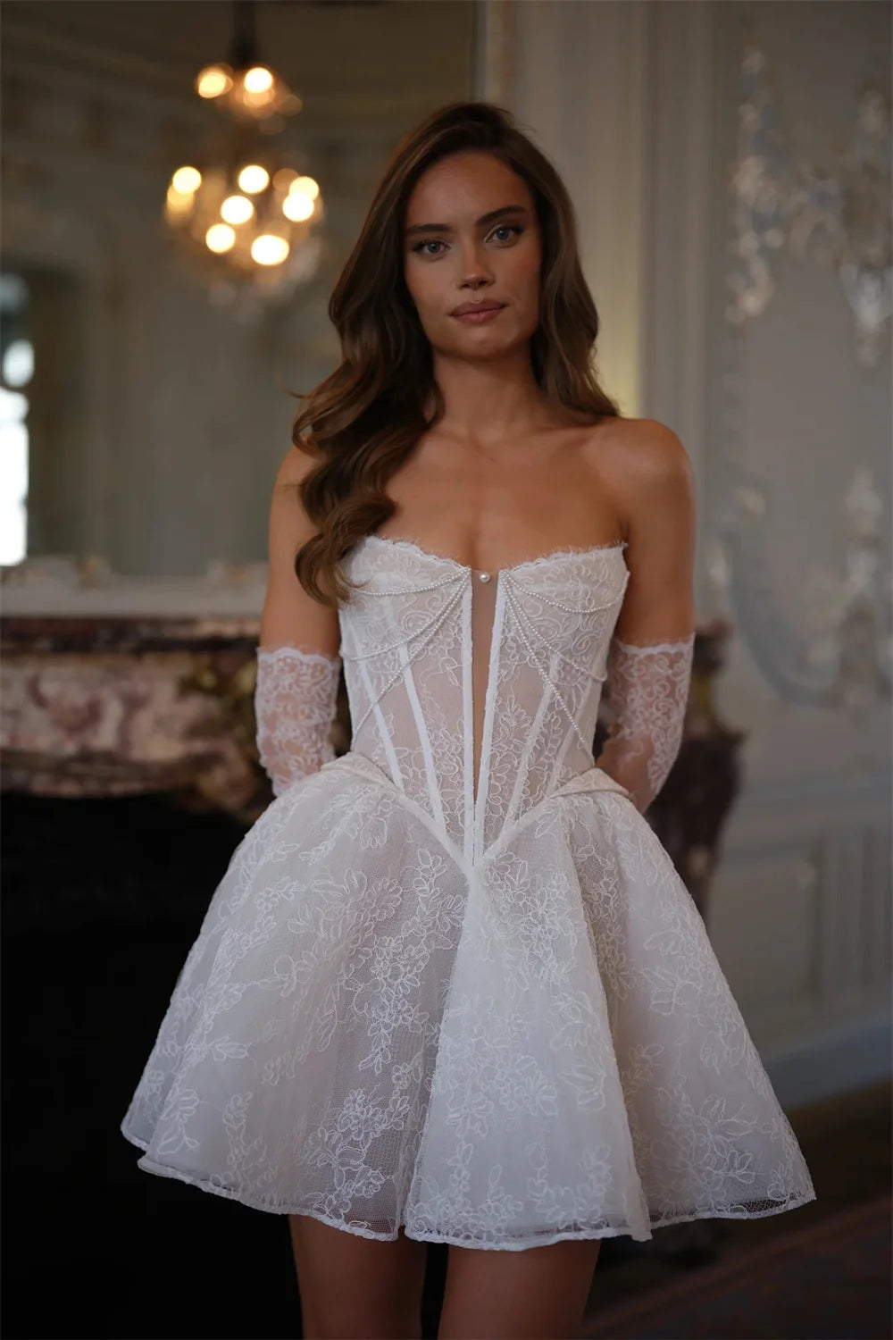 White Mini Wedding Dress Detachable Sleeves A-Line Bridal Gown, Say "I do" to effortless elegance with this flirty mini bridal gown. The A-line silhouette flatters every figure, while the empire waist and deep V-neckline create a chic, modern look. Detachable lace sleeves offer versatility for your big day, and pearl bead embellishments add romantic sparkle. The corset-style lace-up back ensures a custom fit that adjusts to perfection, while the playful above-the-knee skirt keeps things fun and fabulous. Pure bridal bliss in one show-stopping dress.