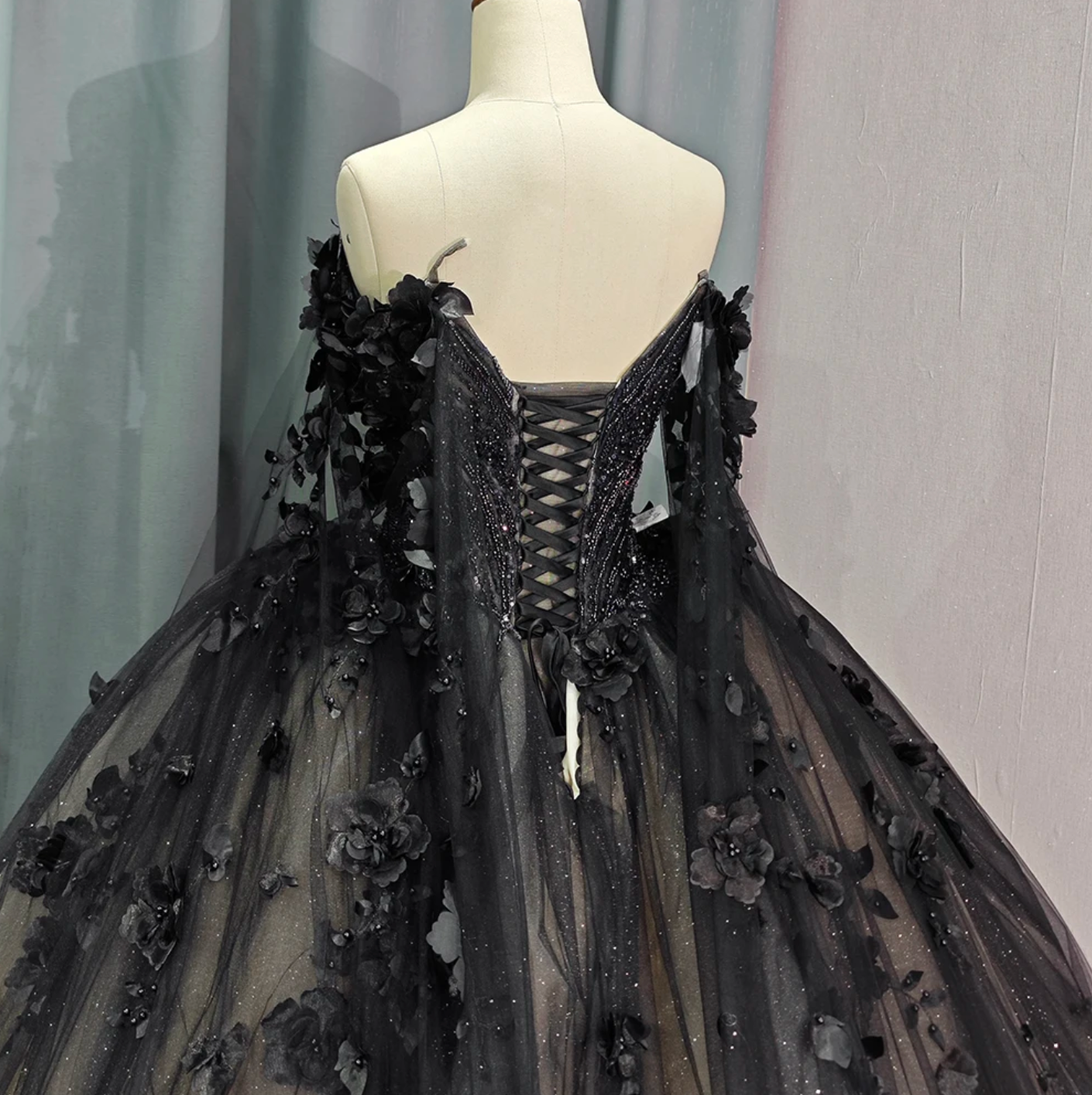 Quinceanera Dress Black Ball Gown Off The Shoulder , Timeless vintage-inspired Black Sweetheart Quinceanera Dress. Featuring an intricate beadwork bodice, off-the-shoulder long sleeves with a dramatic floral drape shoulder cape, this dress exudes glamour and luxury. The black lace overlay complete with hand sewn florals adds a touch of elegance, while the adjustable lace-up back ensures a perfect fit. Elevate your party look with this exquisite ball gown.
