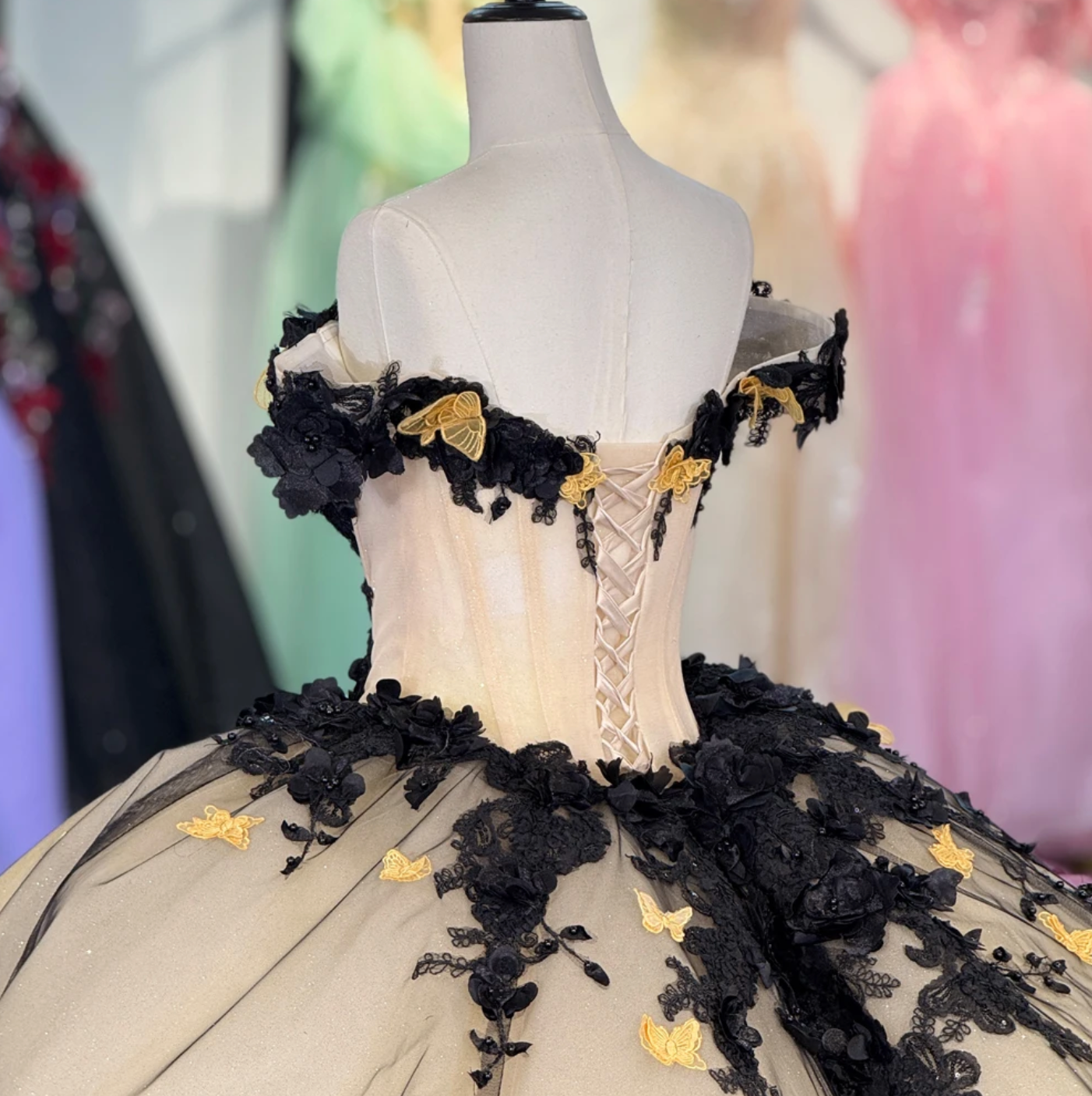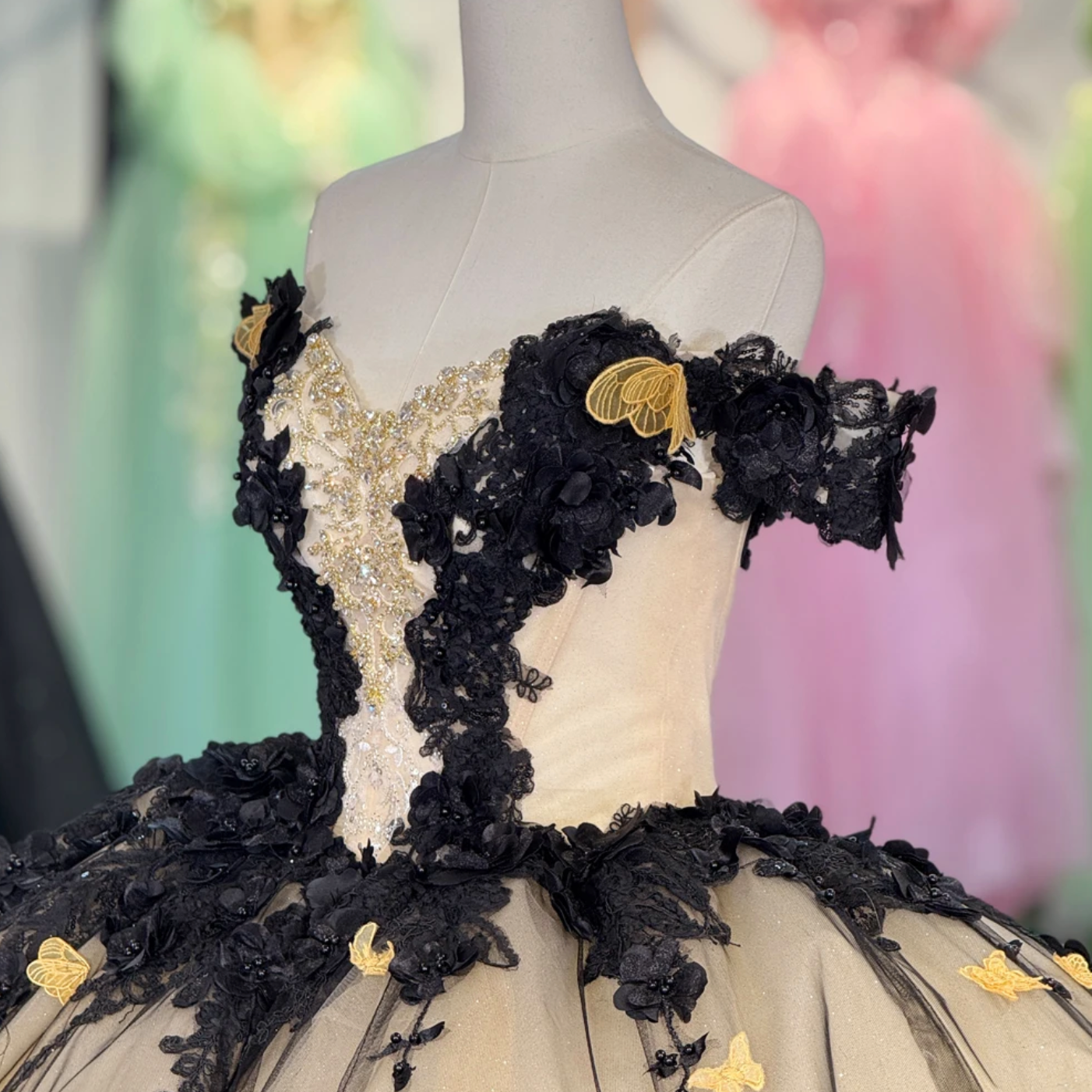 Quinceanera Dress Black Champagne Ball Gown, This sophisticated Black Champagne Quinceañera Dress features a dramatic black lace overlay adorned with floral and butterfly motifs. Off-the-shoulder cuff sleeves and a lace hemline encircle the full ballroom pleated skirt, which cascades elegantly into a train. A lace-up back ensures a perfect fit, making this gown an exquisite choice for your special celebration.
