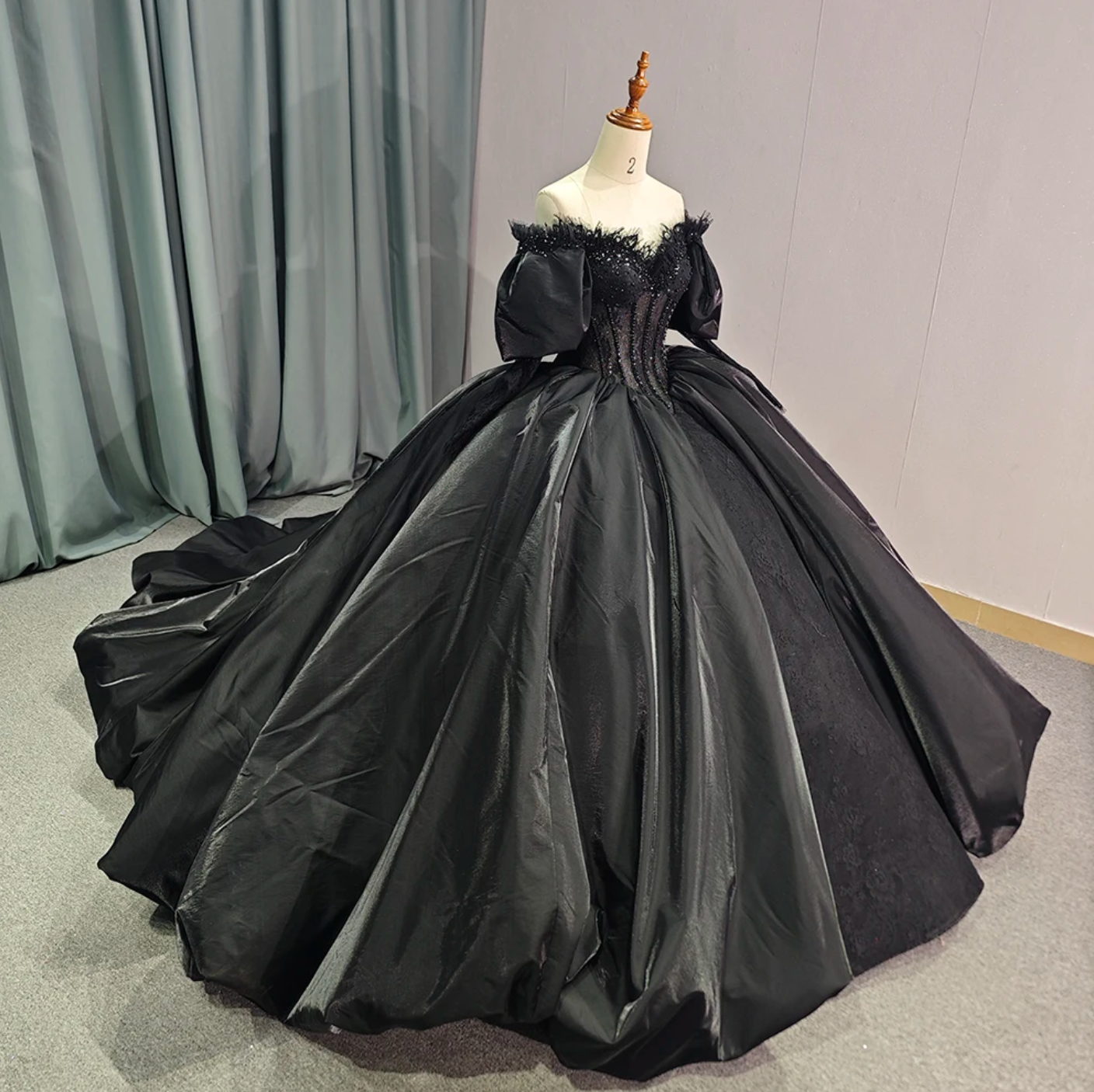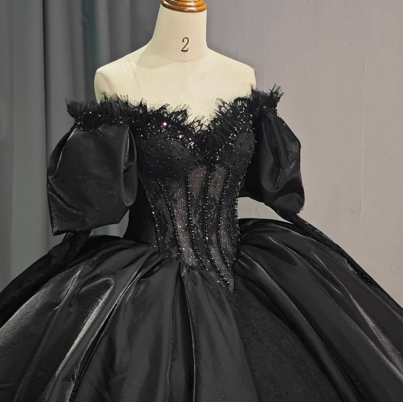 Quinceanera Dress Black Long Sleeves Ball Gown , This luxurious black party ball gown boasts a dazzling beaded corset-style bodice adorned with delicate lace and topped with puffy off-the-shoulder sleeves. The princess waist and full ball gown skirt, complete with a train, create a regal silhouette. The ribbon lace-up back adds a touch of sophistication and allows for a customized fit.