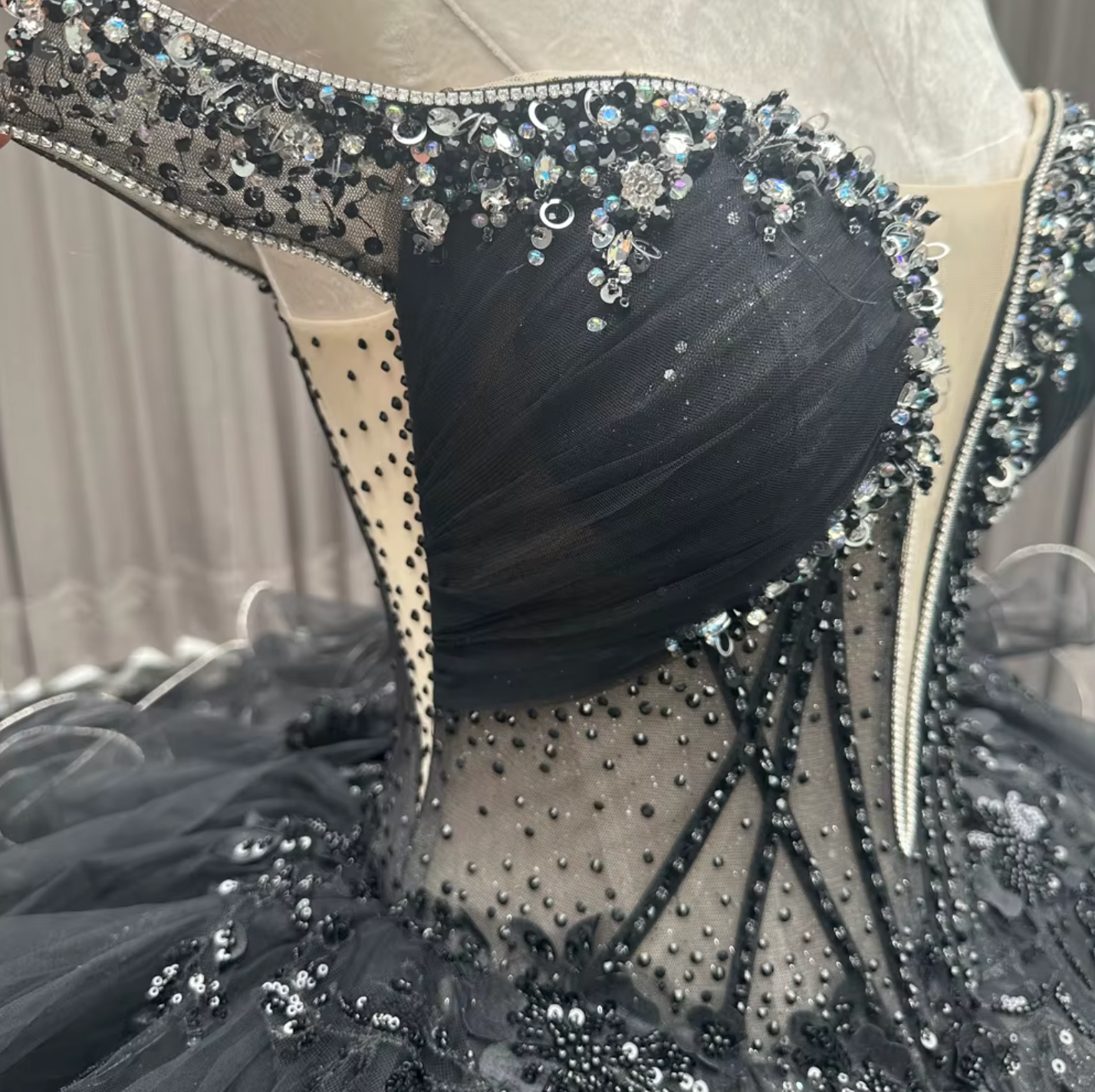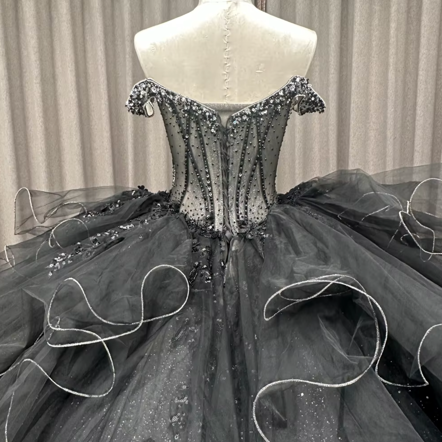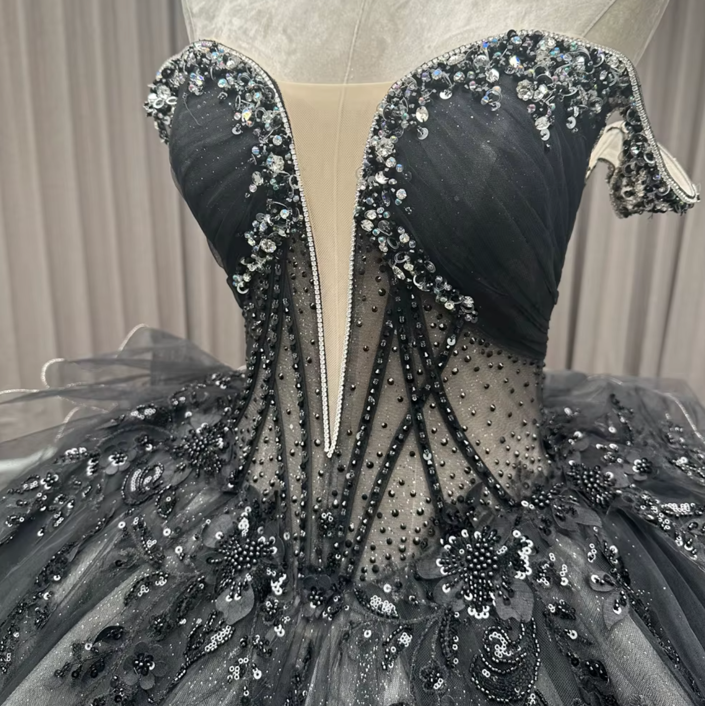 Quinceanera Dress Black Off The Shoulder Ball Gown Indulge in the ultimate high fashion look with our Black Quinceanera Dress! Featuring a stunning deep V front bodice with intricate sequins and beading, this dress will make you stand out in the crowd. The corset style bodice and empire princess waistline provide a flattering fit, while the gathered pleated skirt and lace train add a touch of elegance. Dare to be bold and beautiful.
