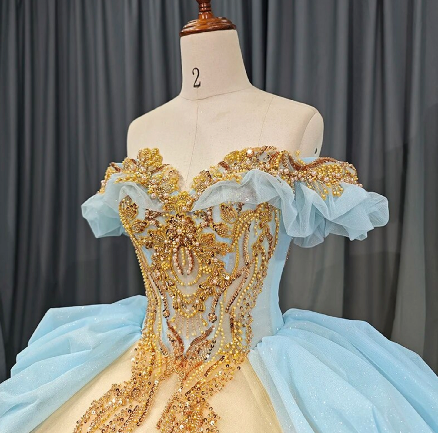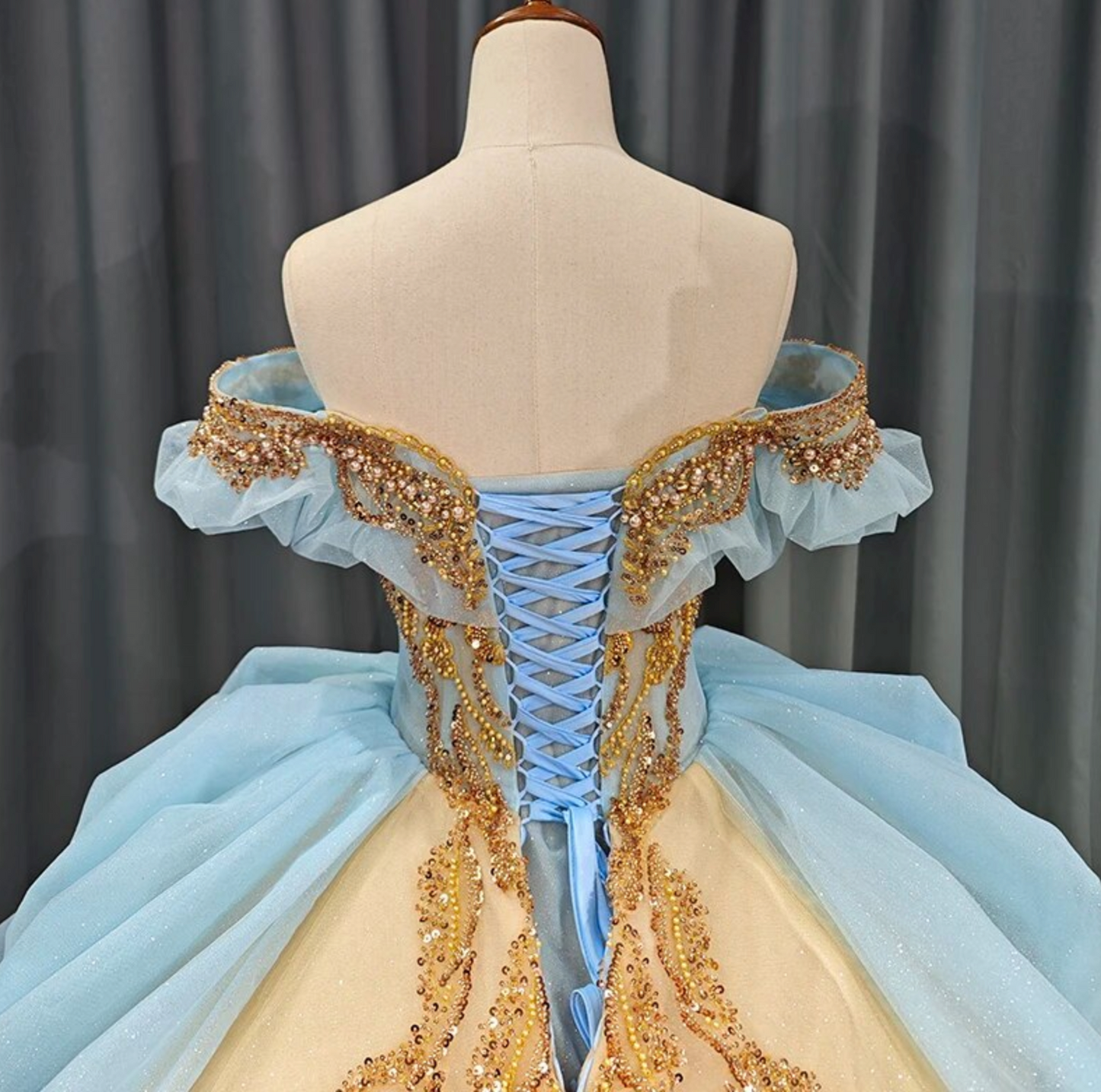 Quinceanera Dress Blue Gold Organza Ball Gown With Train, This unique Quinceanera dress is crafted with luxurious details; a soft, ethereal baby blue hue is complemented by golden accents and a voluminous gown-style skirt. A lace accented bodice with a sweetheart neckline is offset by off-the-shoulder cuff sleeves and a majestic train adorned with ornate lace. To complete the look, the back is designed with an adjustable satin ribbon lace-up closure.