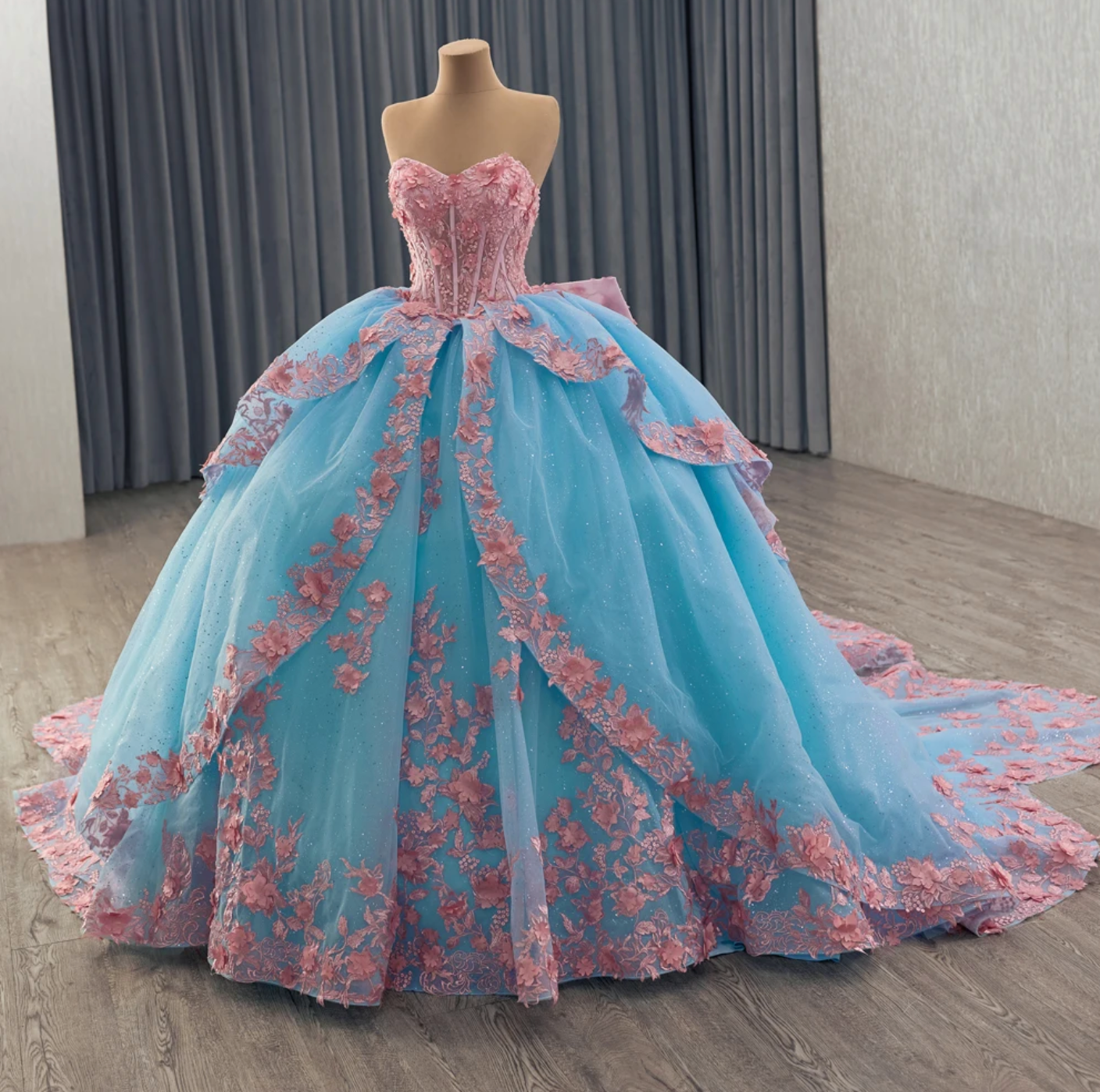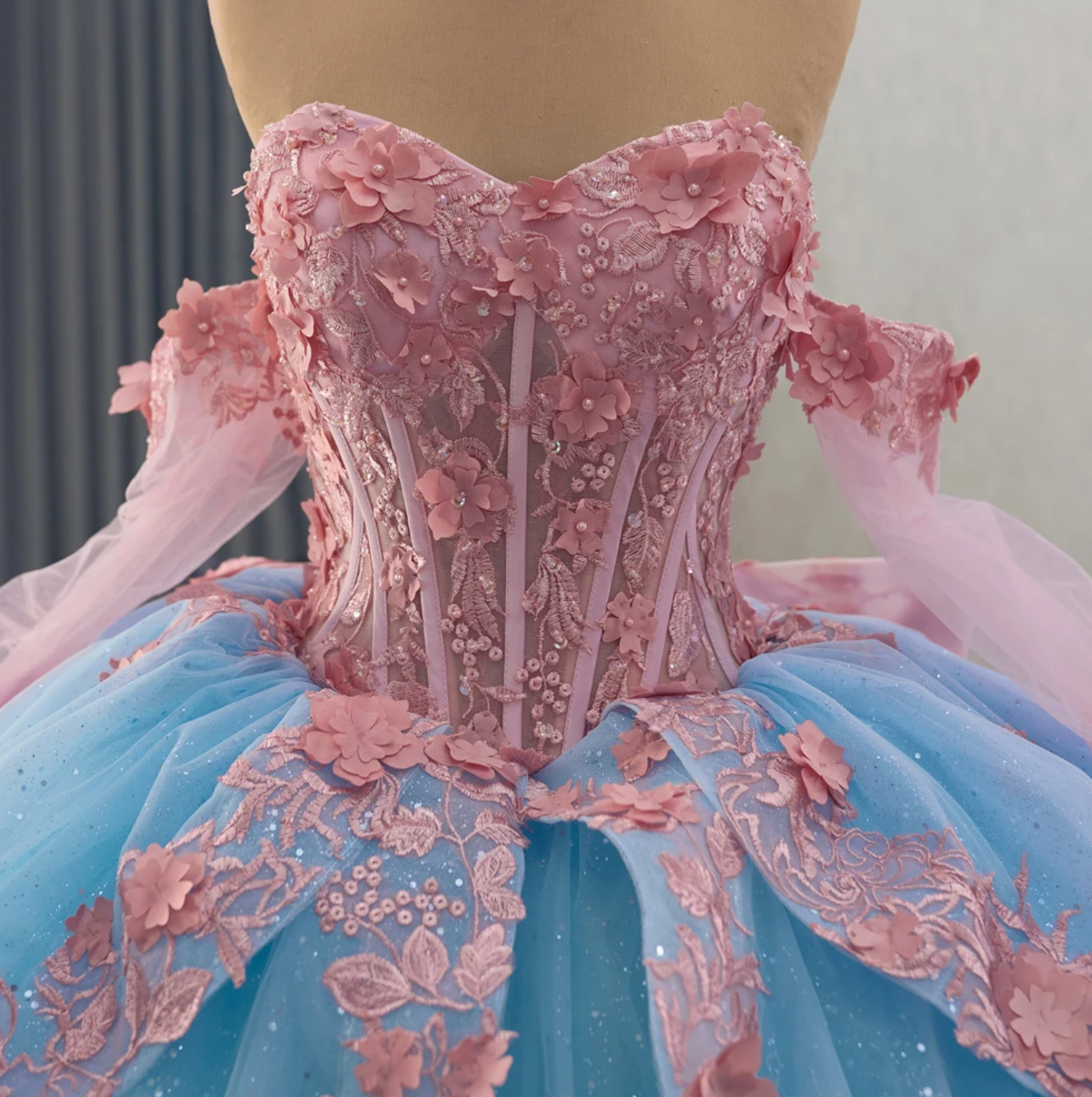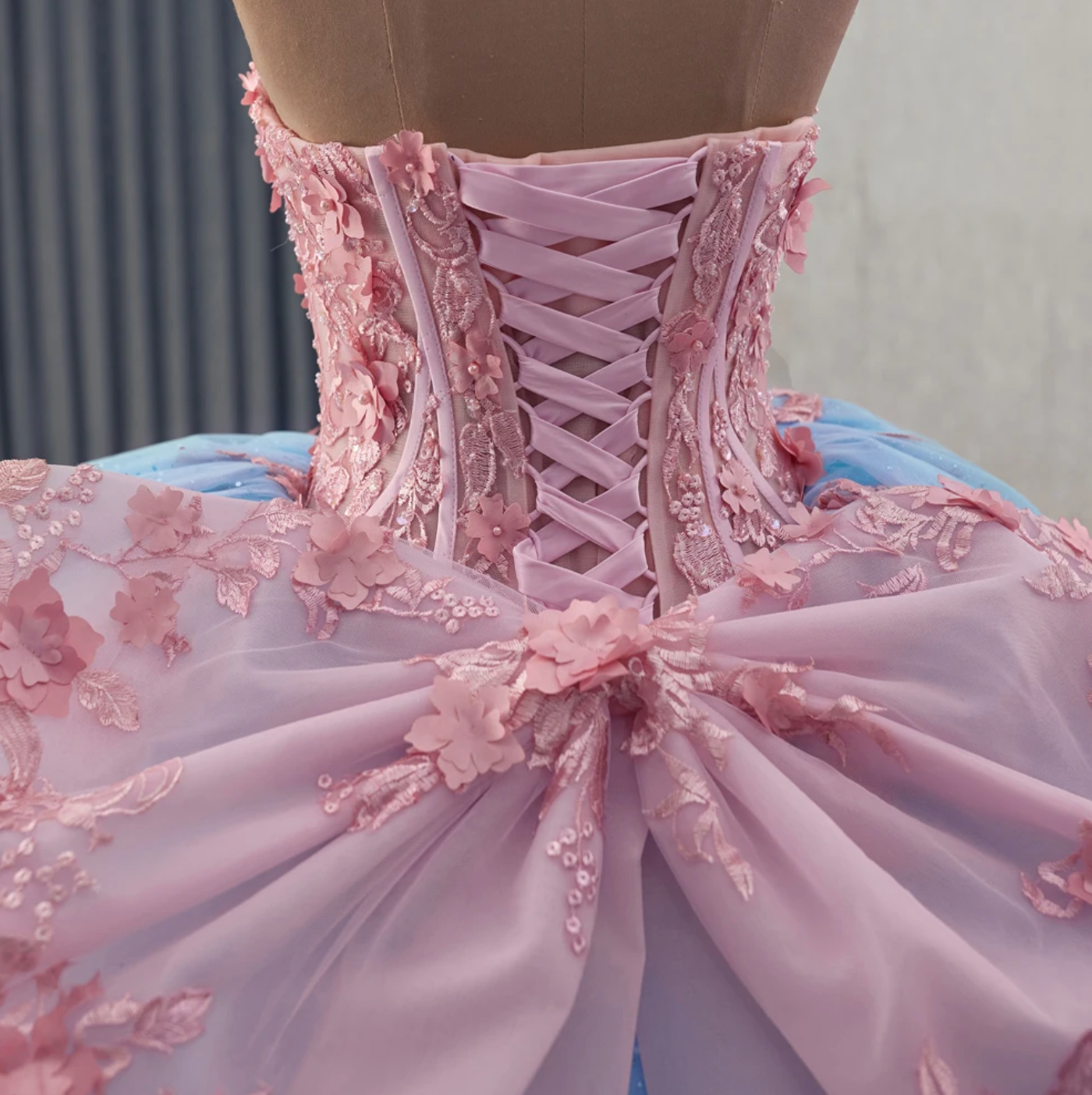 Quinceanera Dress Blue Pink Organza Lace Up Back Ball Gown, combines fantasy and elegance with a sweetheart corset bodice adorned by hand-sewn floral beading. Delicate lace tulle peplums and detachable half-sleeve cuffs enhance its refined silhouette. The layered skirt and train feature lace accents and a full peplum, creating a graceful flow. A lace-up back ensures a perfect fit, making this gown an impeccable choice for your special celebration.