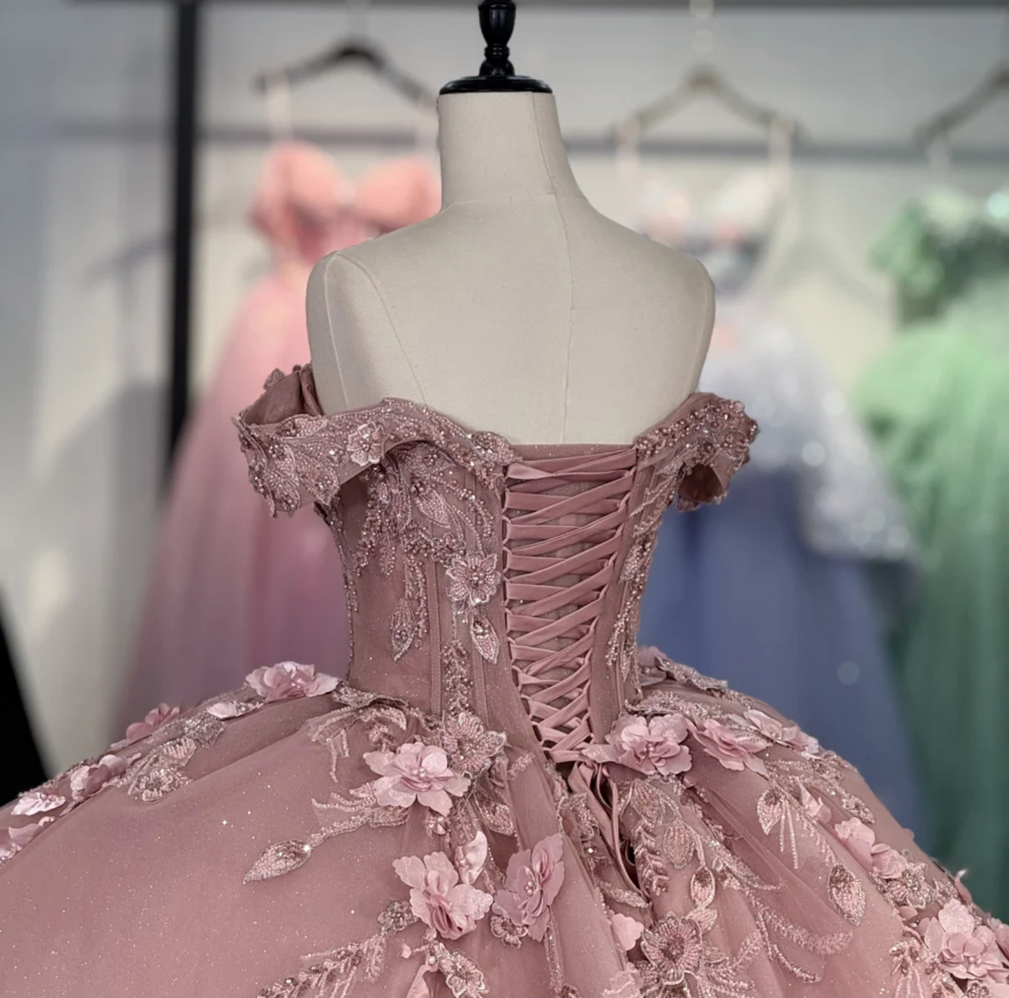 Quinceanera Dress Dusty Pink Party Ball Gown, This Dusty Pink Quinceanera Dress exudes elegance with its off-the-shoulder cuff sleeves and corset-style sweetheart bodice. Hand-beaded detailing adorns the front and back, enhancing the intricate design. The skirt features a center gather accented by delicate floral embellishments, flowing gracefully into a train. A lace-up back ensures a customizable, perfect fit, making this ball gown an exquisite choice for a memorable celebration.