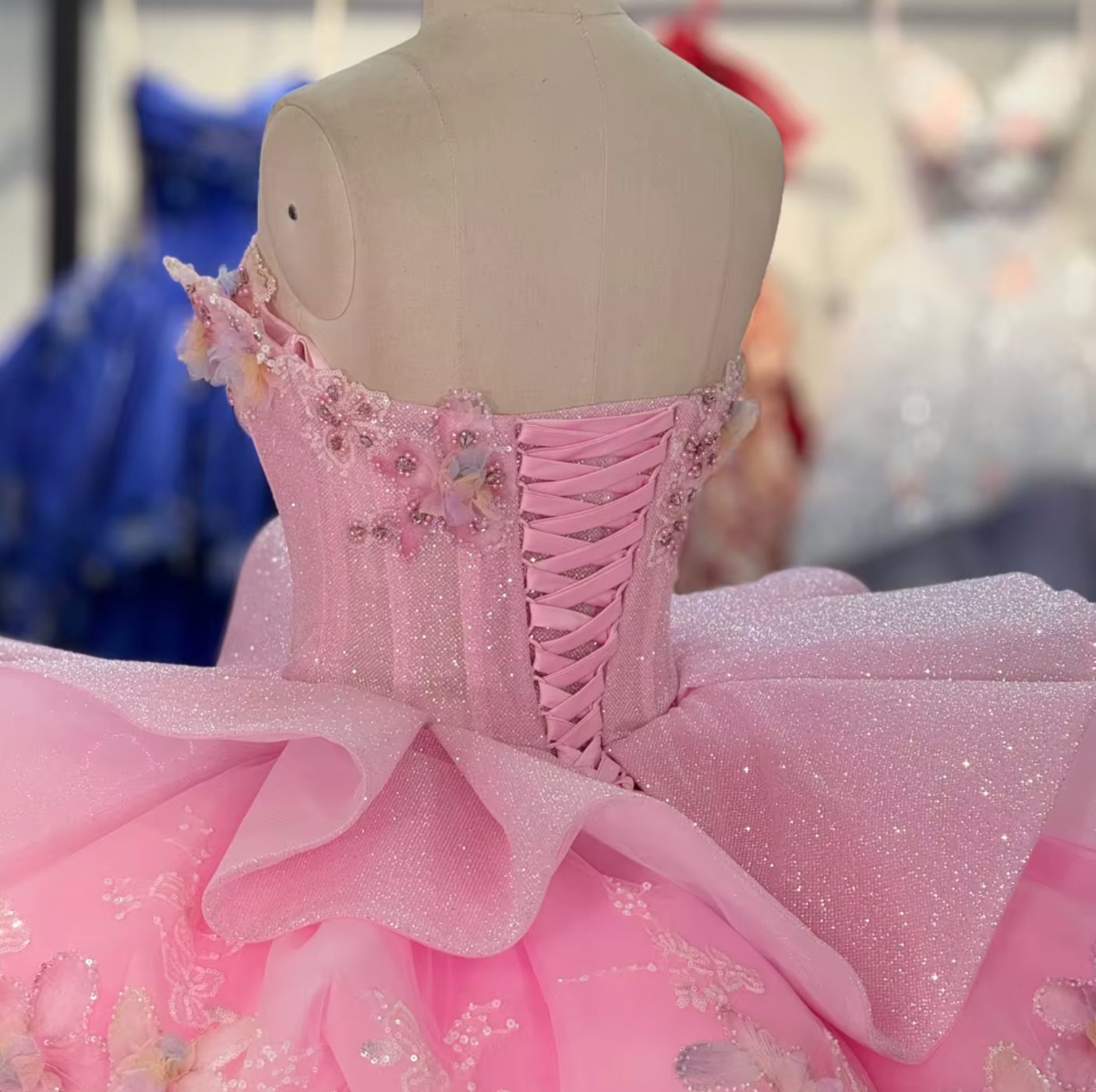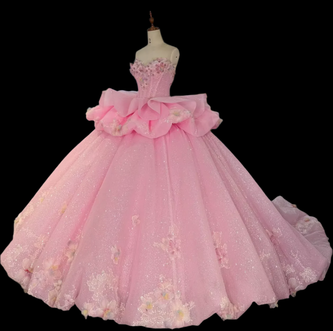 Quinceanera Dress Pink Beaded Lace Sweetheart Ball Gown, Indulge in the enchanting allure of this exquisite pink Quinceanera gown. The lavish sequined ball silhouette features a flattering peplum waist and elegant sweetheart bodice with corset-style structuring. Delicate floral embellishments adorn the sleeveless design, while the lace-up back ensures a customized, comfortable fit for your momentous celebration. This sophisticated creation transforms your special day into a truly regal affair.