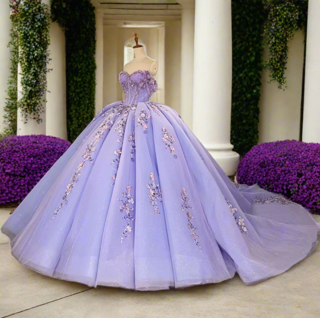 Purple Lilac Floral Quinceanera Dress, Elevate your celebration in this exquisite purple lilac ball gown, featuring an elegantly pleated full skirt and refined corset bodice with a sweetheart neckline. Delicate floral embellishments adorn both the structured bodice and voluminous skirt, while adjustable shoulder straps provide sophisticated support. The lace-up back ensures a customized fit, and the flowing train creates a captivating silhouette. This ethereal creation transforms your special moment into an unforgettable affair of timeless elegance.