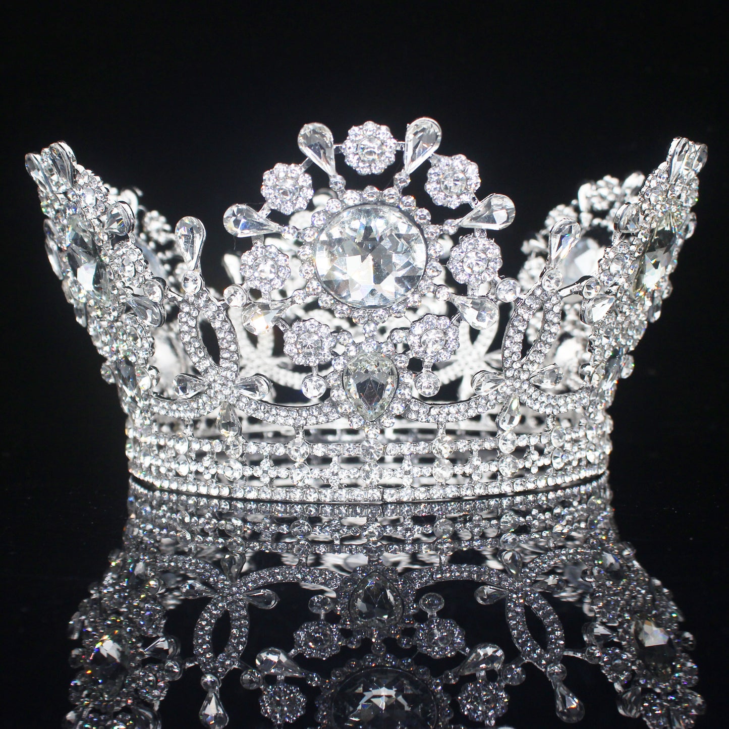 Round Crystal King Queen Crown Royal Party Tiara Hair Accessory, reign in radiance with this show-stopping royal crown! Featuring a stunning 3-row crystal-lined bottom rim adorned with an elegant swag ribbon pattern, this full round crown boasts towering high points crowned with a large, luminous round crystal. Choose your favorite color to match your regal mood, complemented by intricate accent crystals scattered throughout. Every angle sparkles with meticulously cut details and vintage-inspired craftsmanship, making this the ultimate statement piece for anyone ready to rule their special day with glamorous flair.
