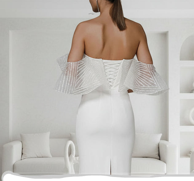 Tea Length Wedding Dress White Bridal Sheath Lace Up Bridal Dress, make a statement in this stunning tea length wedding dress that combines elegance with just the right amount of drama. The bare-shoulder side ruffle adds romantic flair and movement, while the streamlined bodice and straight skirt create a sleek, sophisticated silhouette. The adjustable lace-up back ensures a custom fit that feels as good as it looks, and the practical back leg slit makes walking and dancing a breeze. Perfect for the playful bride who wants to turn heads without sacrificing comfort, this dress balances classic bridal beauty with modern edge—ideal for ceremonies, receptions, and all the fun moments in between.