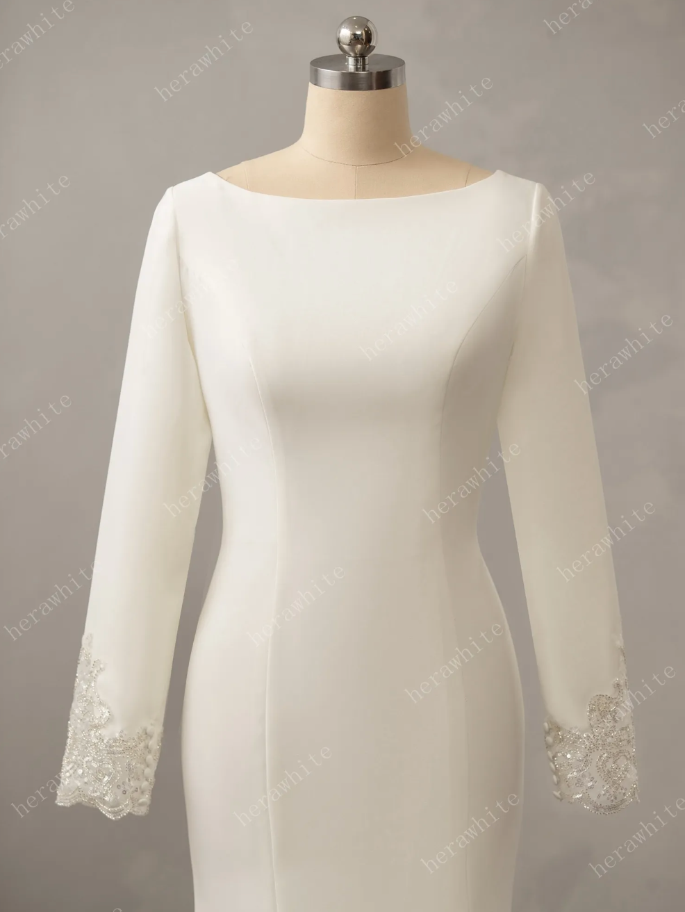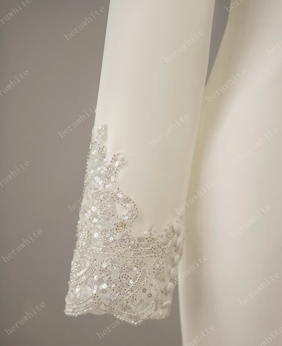 Long Sleeve Crepe Wedding Dress Mermaid Fit Flare Bridal Gown, created in a rich crepe fabric, the romantically fit and flare silhouette is going to accentuate your shape. The mermaid wedding dress starts with a bateau neckline, an elaborately beaded motif on the back and long sleeves show that the beauty is all in the details. Photos in ivory color.