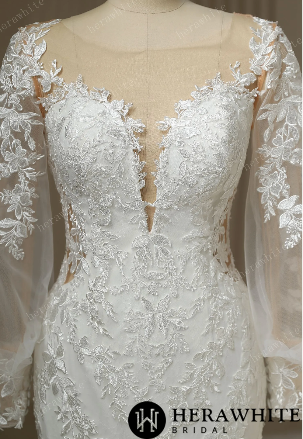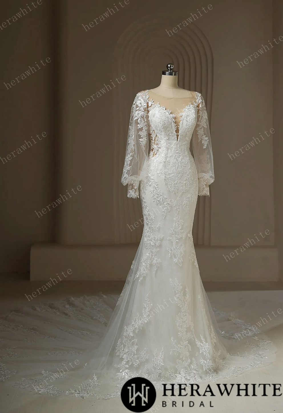 Long Train Mermaid Lace Wedding Dress, Get ready to turn heads in this stunning Long Train Mermaid Bridal Lace Wedding Dress! The intricate beading and floral pattern on the baroque lace bodice and tulle skirt add a touch of opulence, while the plunging neckline and lace side cutouts add a sexy twist. The long lace sleeves and sculpted train further enhance the drama of this breathtaking gown.