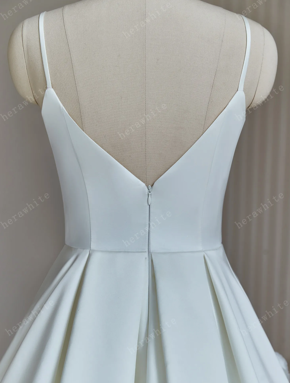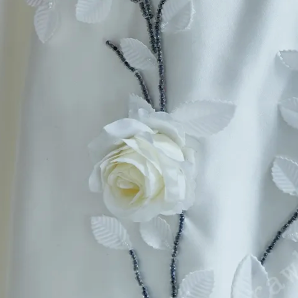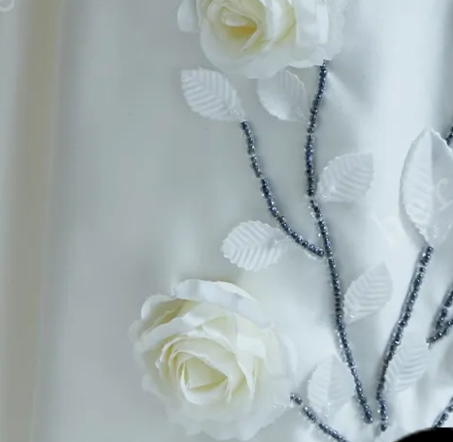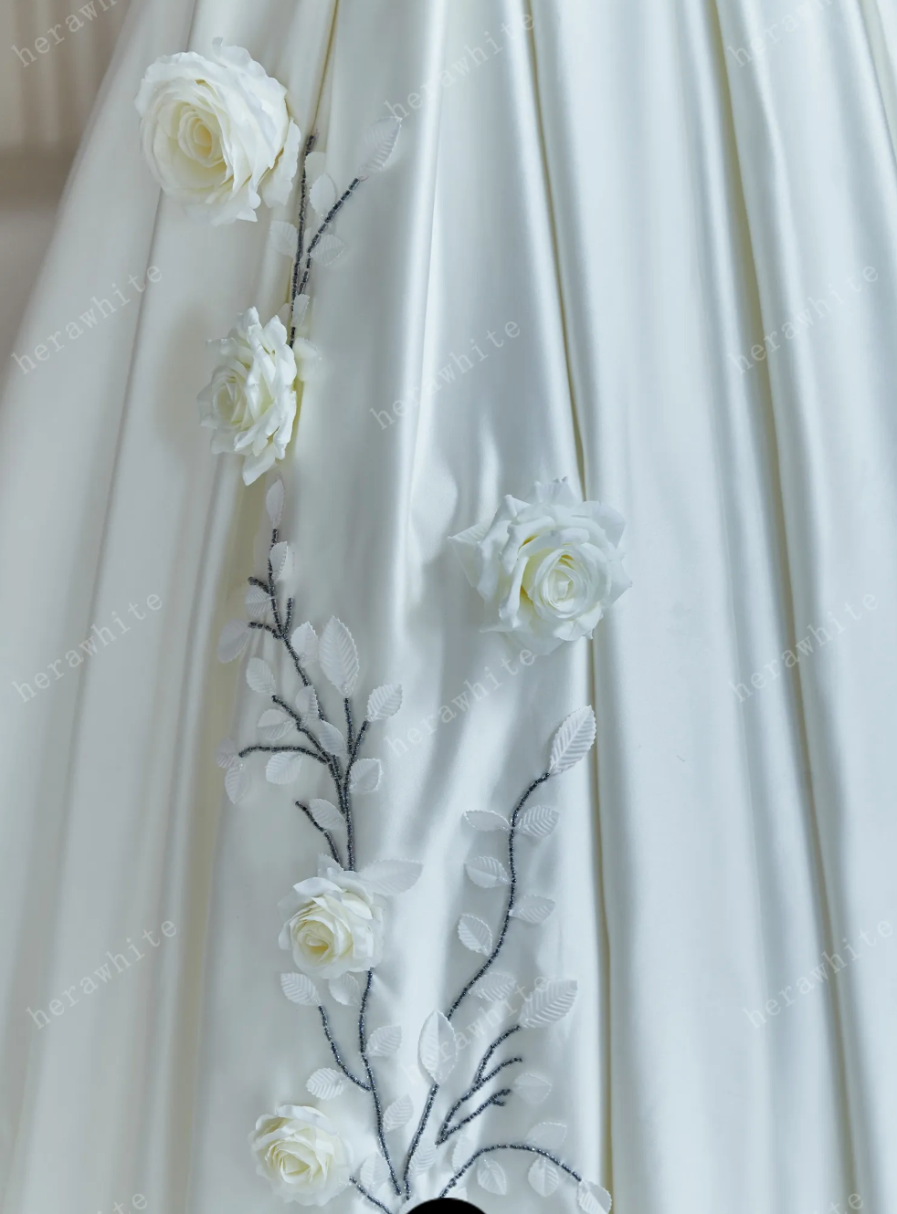 Satin A Line Wedding Dress, The delicate A-line wedding dress with spaghetti straps exudes an air of sophistication and elegance. As the eye travels down the gown, the lower skirt is beautifully adorned with a scattering of pure white roses, adding a touch of romance and whimsy to the overall look. This design not only captures the essence of modern style but also incorporates classic elements, making it a timeless choice for the bride who seeks a perfect blend of tradition and contemporary flair on her special day.