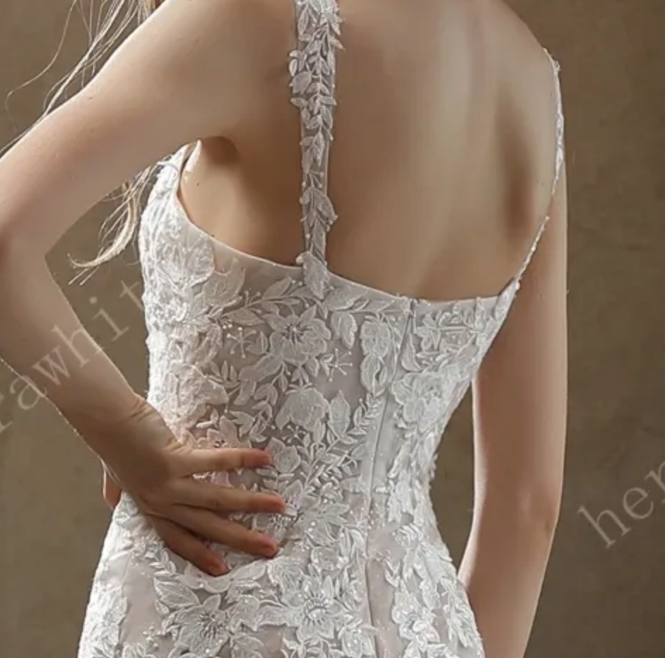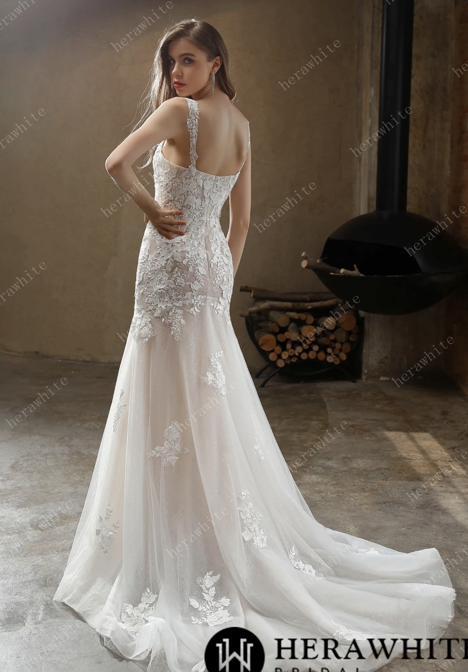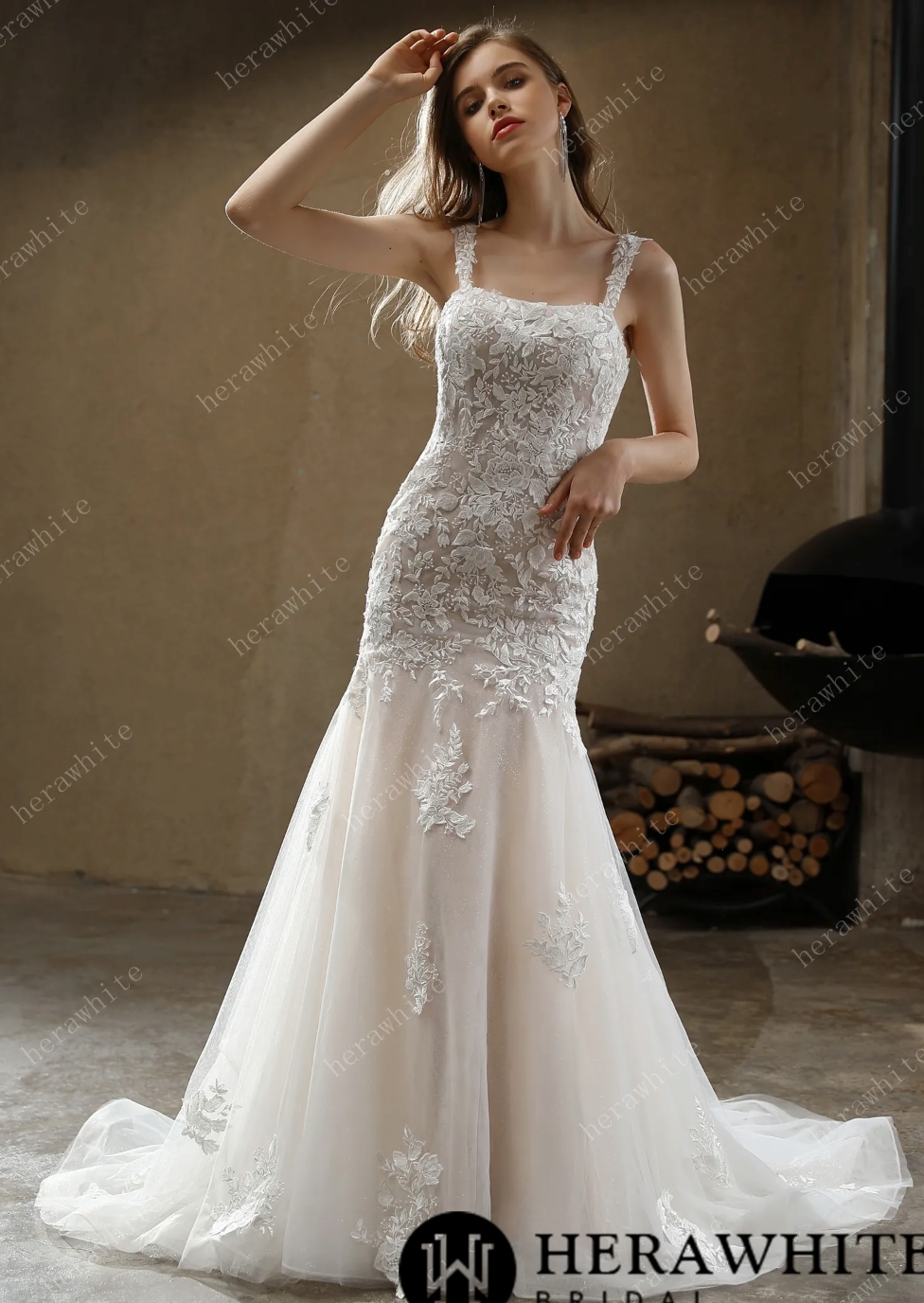 Sparkle Tulle Mermaid Wedding Dress Lace Bridal Gown, a rich, flawless mermaid wedding gown. The delicate lace straps meet a soft square neckline bodice accented with floral lace that down to the mermaid skirt, with a low back completes the look. The dress is shown in Ivory/Dark Ivory.