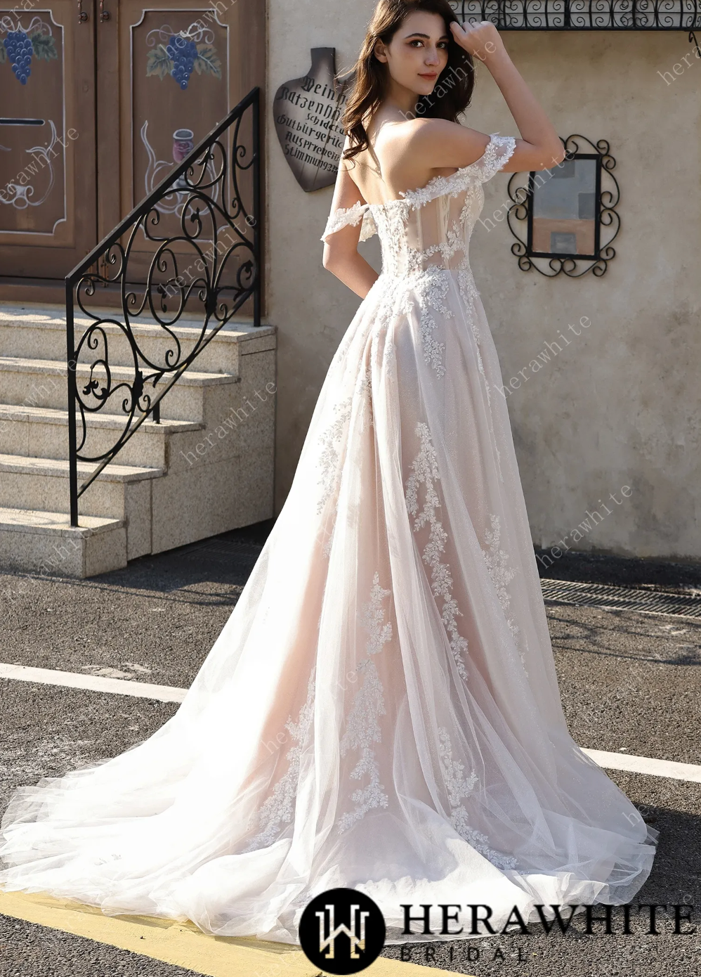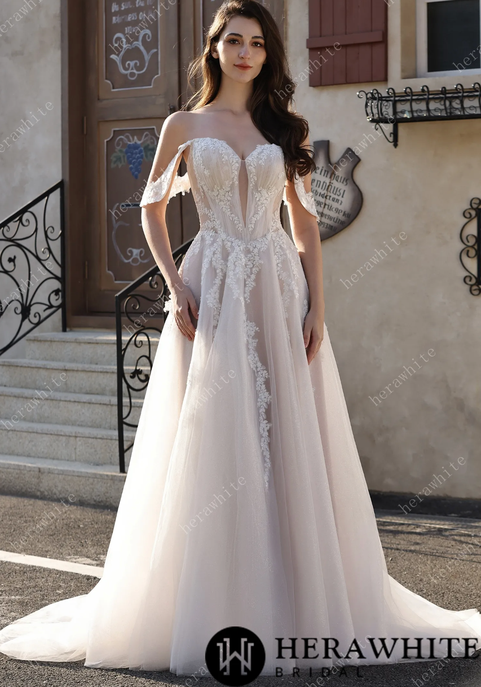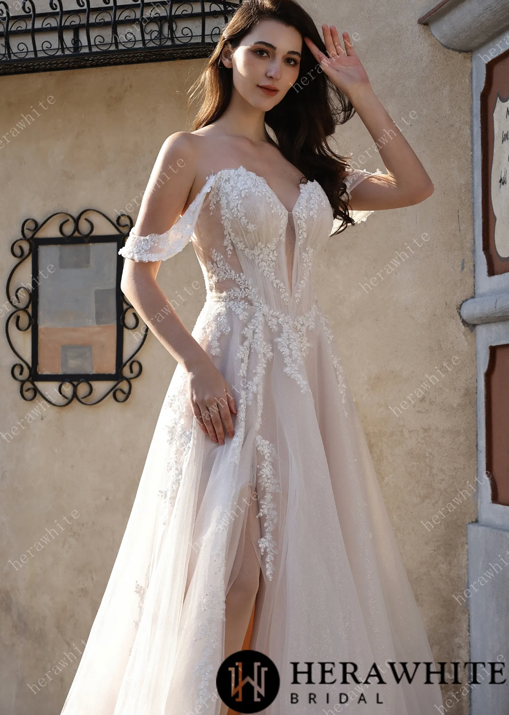 Glitter Tulle Wedding Dress Off-the-Shoulder Sheer Lace Bridal Gown, radiate romance with a modern twist in this captivating bridal gown that refuses to play it safe. The off-the-shoulder sweetheart neckline is beautifully framed by delicate sheer lace cap sleeves, while intricate leaf appliqués cascade down the bodice and sheer tulle overlay with artistic grace. A subtle plunging sheer panel adds just the right amount of contemporary edge, and the fitted corset bodice ensures a stunning silhouette. The real showstopper? The flowing A-line skirt crafted from shimmering blush glitter tulle, complete with a daring high thigh slit for movement and a sweeping train that catches the light with every step. This is the dress for the bride who wants to blend timeless femininity with bold, modern confidence.