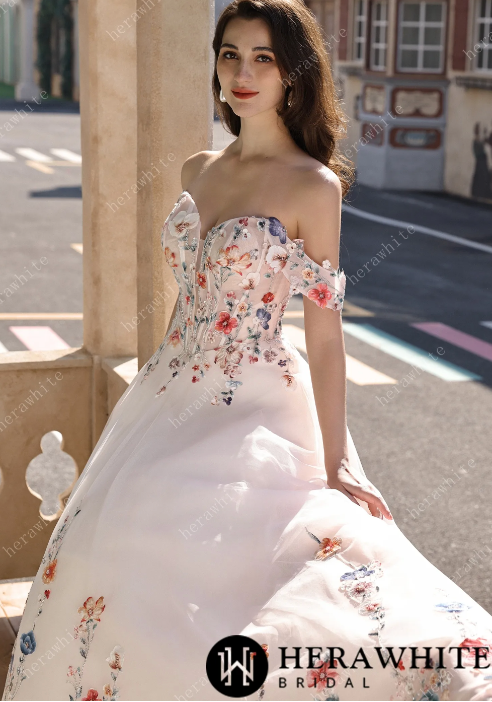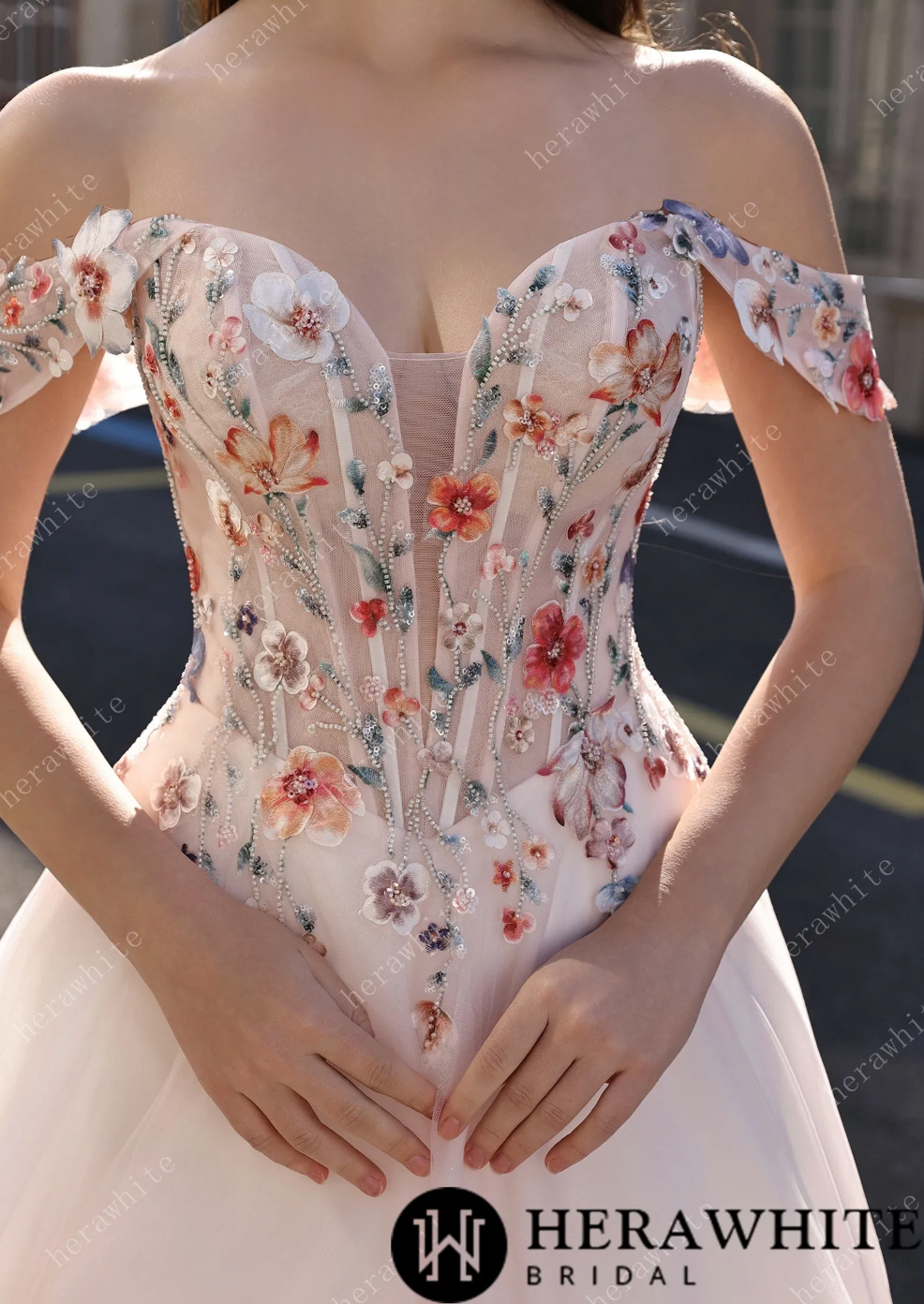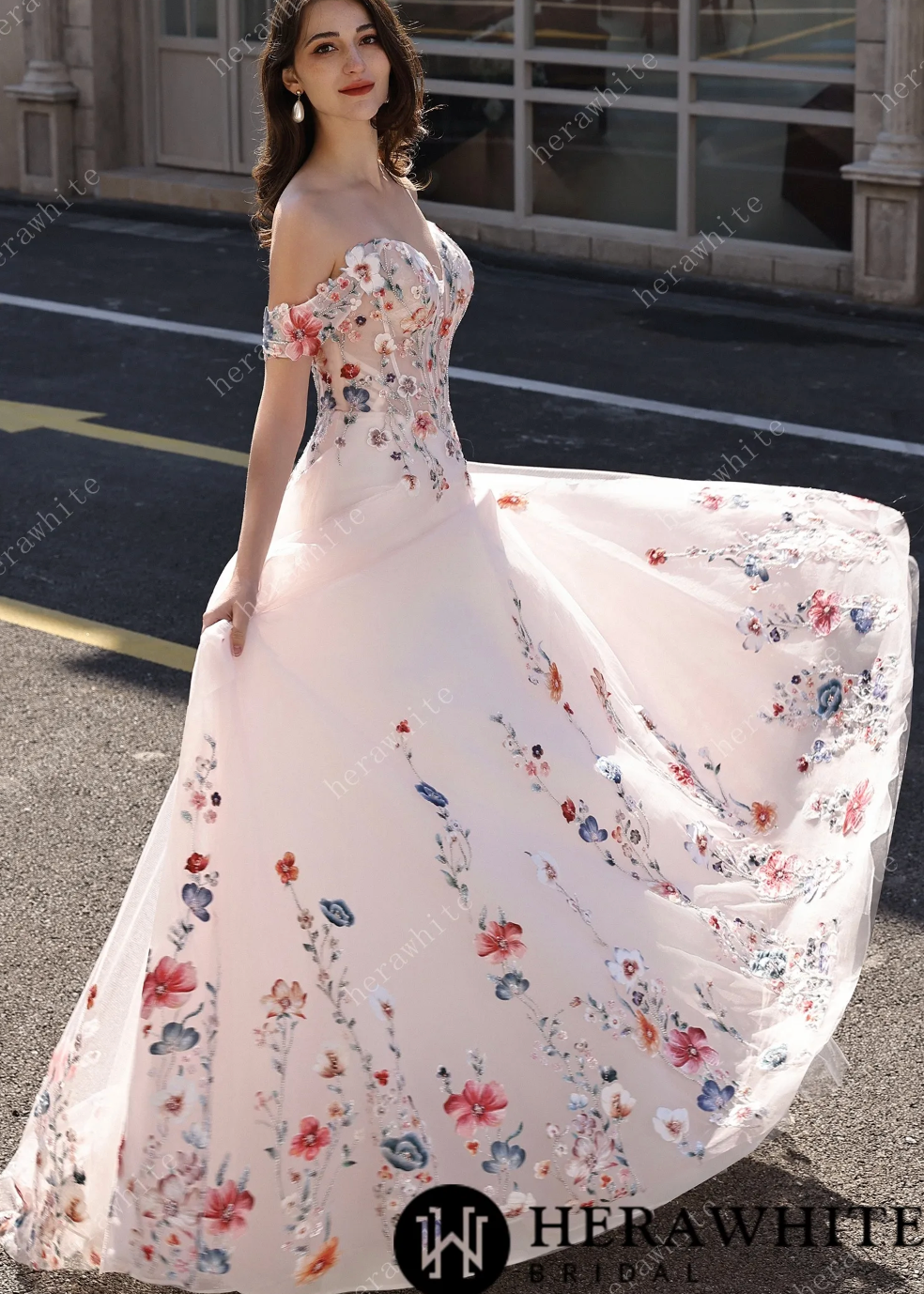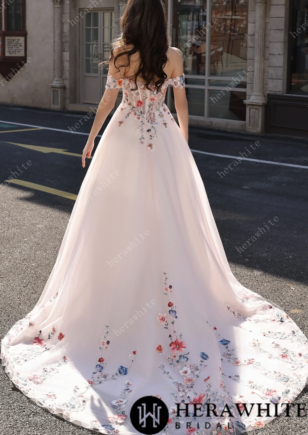 Lace Wedding Dress With Off-Shoulder Sleeves Blush Pink Bridal Gown, This enchanting bridal gown combines romance with a burst of color through its exquisite floral lace design. The lightweight tulle fabric drapes beautifully in a flattering A-line silhouette, while the off-shoulder sweetheart neckline and delicate sleeves showcase intricate embroidery in vibrant pink, red, and blue blooms. A tailored corset-style bodice transitions into a skirt adorned with cascading floral appliqués that dance down to a sweeping train, creating movement with every step. Set against a soft blush backdrop, this dress perfectly balances timeless elegance with playful, whimsical charm—ideal for the bride who wants to make a joyful, unforgettable entrance.