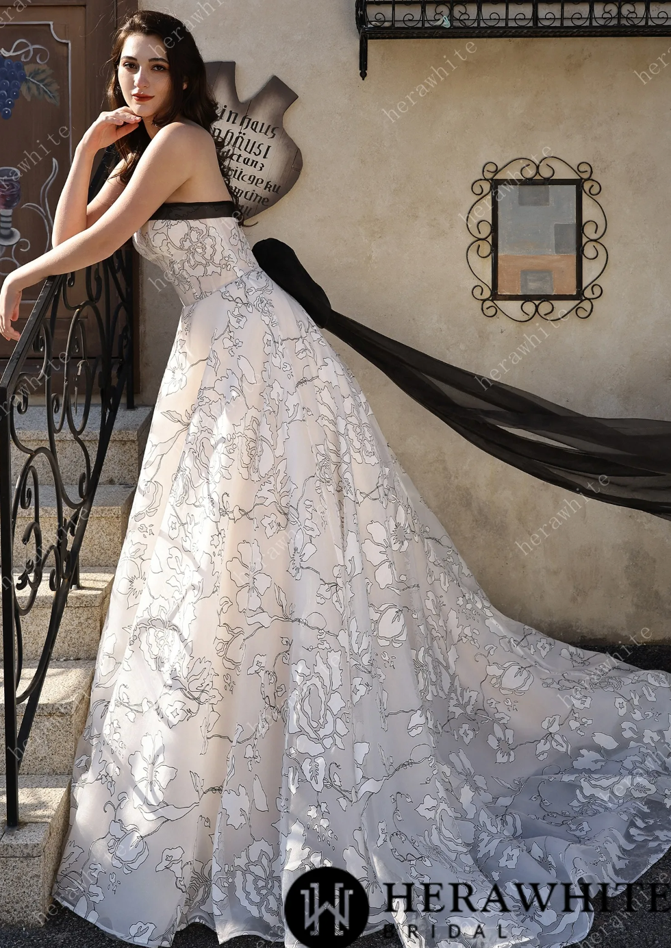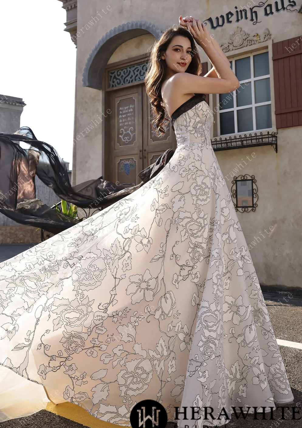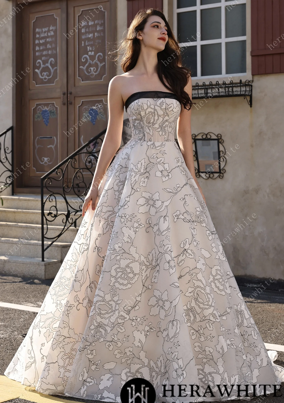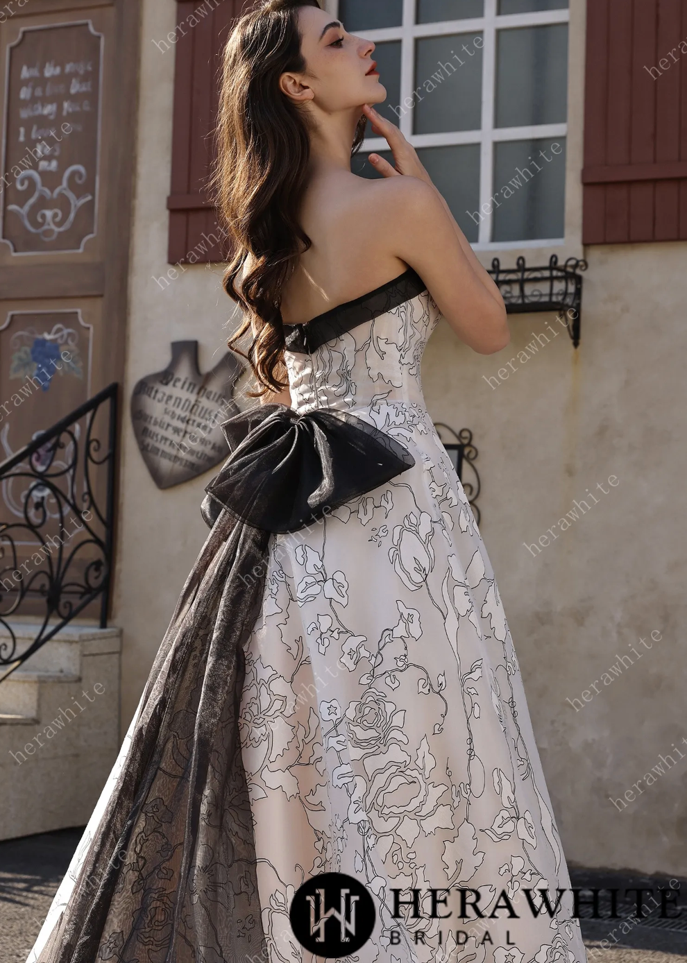 Organza Wedding Dress Black Ivory Bridal Gown Back Detachable Bow, Make a striking entrance in this modern masterpiece that flips the script on traditional bridal wear. Crafted from luxurious ivory organza, the gown features bold black line-art florals that dance across the fabric with artistic flair. The strapless bodice is trimmed in sleek black for a chic contrast, while a cinched waist creates a flattering silhouette. The real showstopper? A detachable oversized bow at the back that commands attention and lets you switch up your look throughout the day. This gown is pure fun—it's romantic, it's daring, and it's absolutely unforgettable for the bride who refuses to blend in.