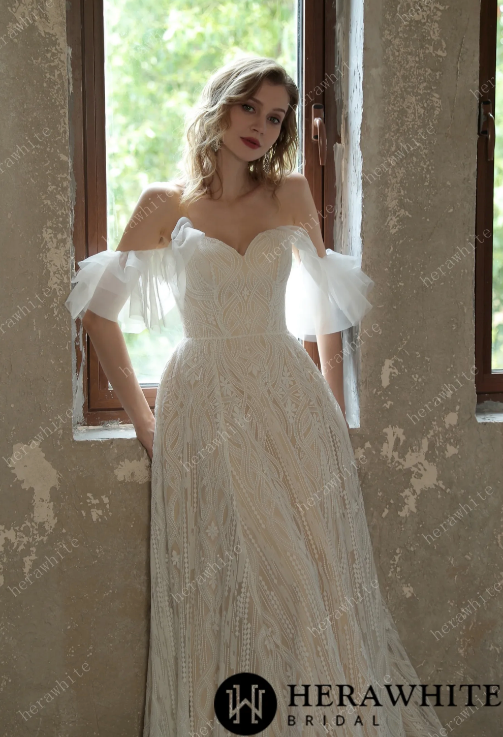 Wedding Dress Allover Lace Boho Gown With Corset Back, Allover matte lace brings a free-spirited vibe to the A-line skirt, creating a romantic look with the addition of off-the-shoulder organza straps gracing the shoulders. The sweetheart neckline in the bodice is complemented by the deep corset back detail and finished with a soft sweeping train for a beautiful vintage touch.