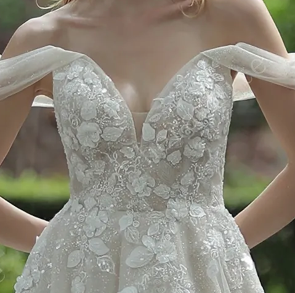 Wedding Dress Floral Lace with Off-Shoulder Straps, The designer skillfully incorporated an off-shoulder design to accentuate the feminine curves, while adding floral appliques for a touch of sophistication to the wedding gown. The A-line skirt enhances the elegance of the dress, and the soft shimmer tulle underlay adds a charming allure as the bride walks. Whether it's a minimalist or romantic wedding style, this dress is a perfect match.