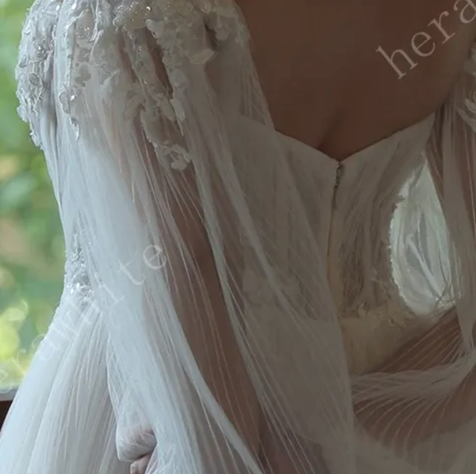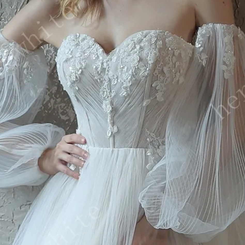 Wedding Dress Pleated Tulle A-line Gown With Pouf Sleeves, Our wedding dress is a whimsical A-line with enchanting details. The sweetheart bodice features stunning embroidered appliques over pleats , with boning to offer structure. A clean and ethereal tulle skirt completes the soft A-line silhouette, exuding a subtle romanticism that gracefully flows into a gentle sweeping train. Detachable long pouf sleeves add to the fairytale feeling of the gown.