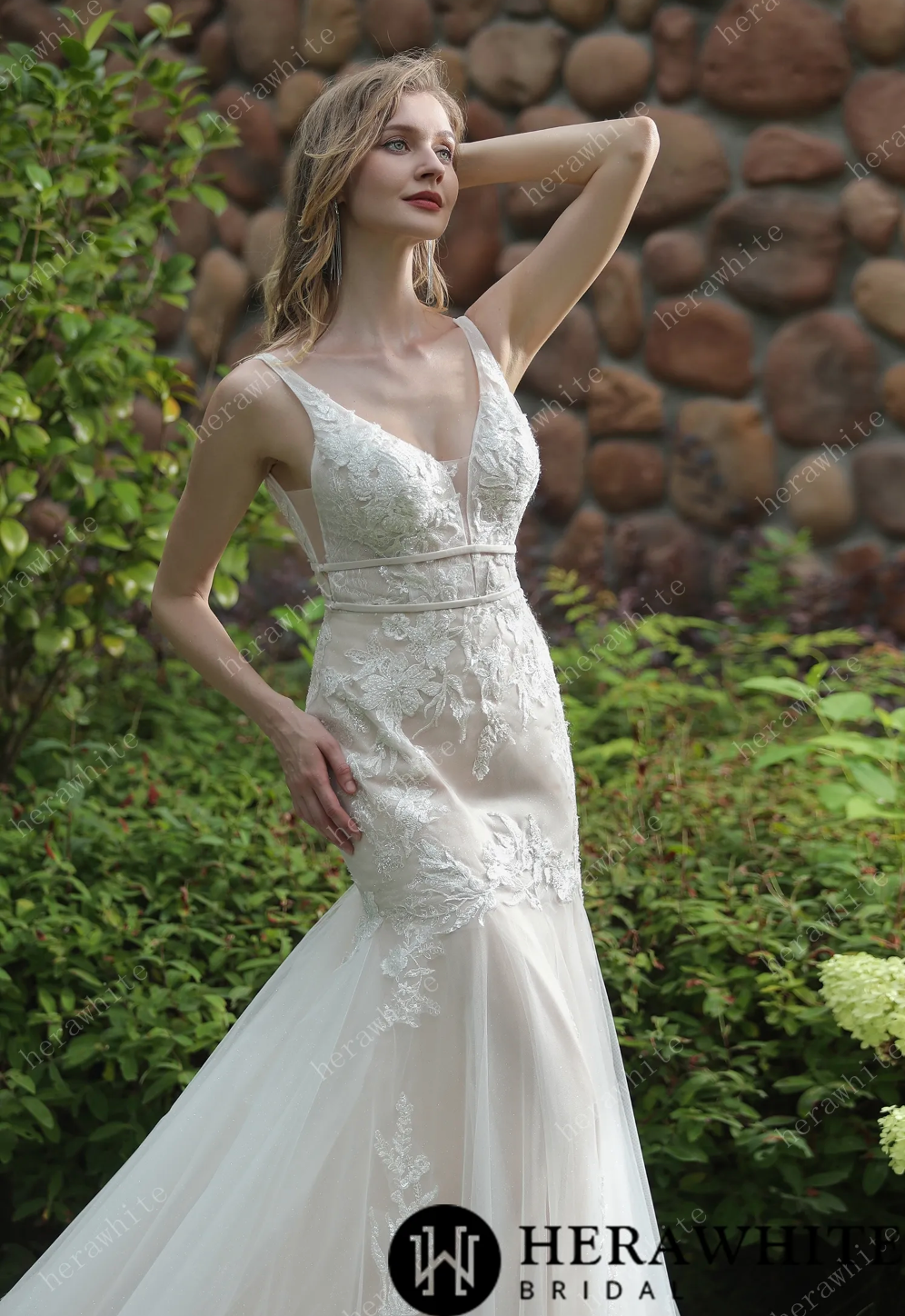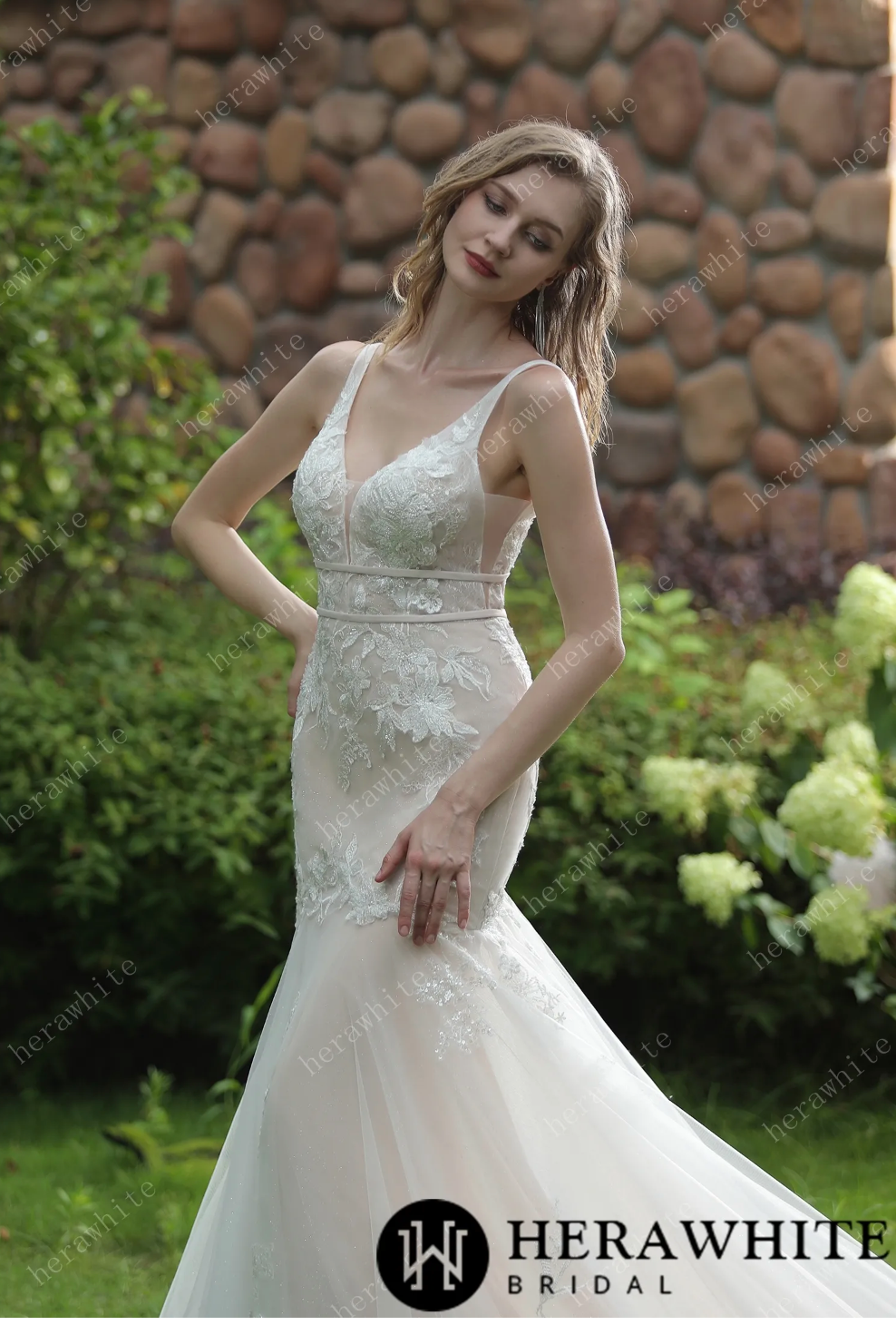 Wedding Dress Plunging Beaded Mermaid Gown With Double Band