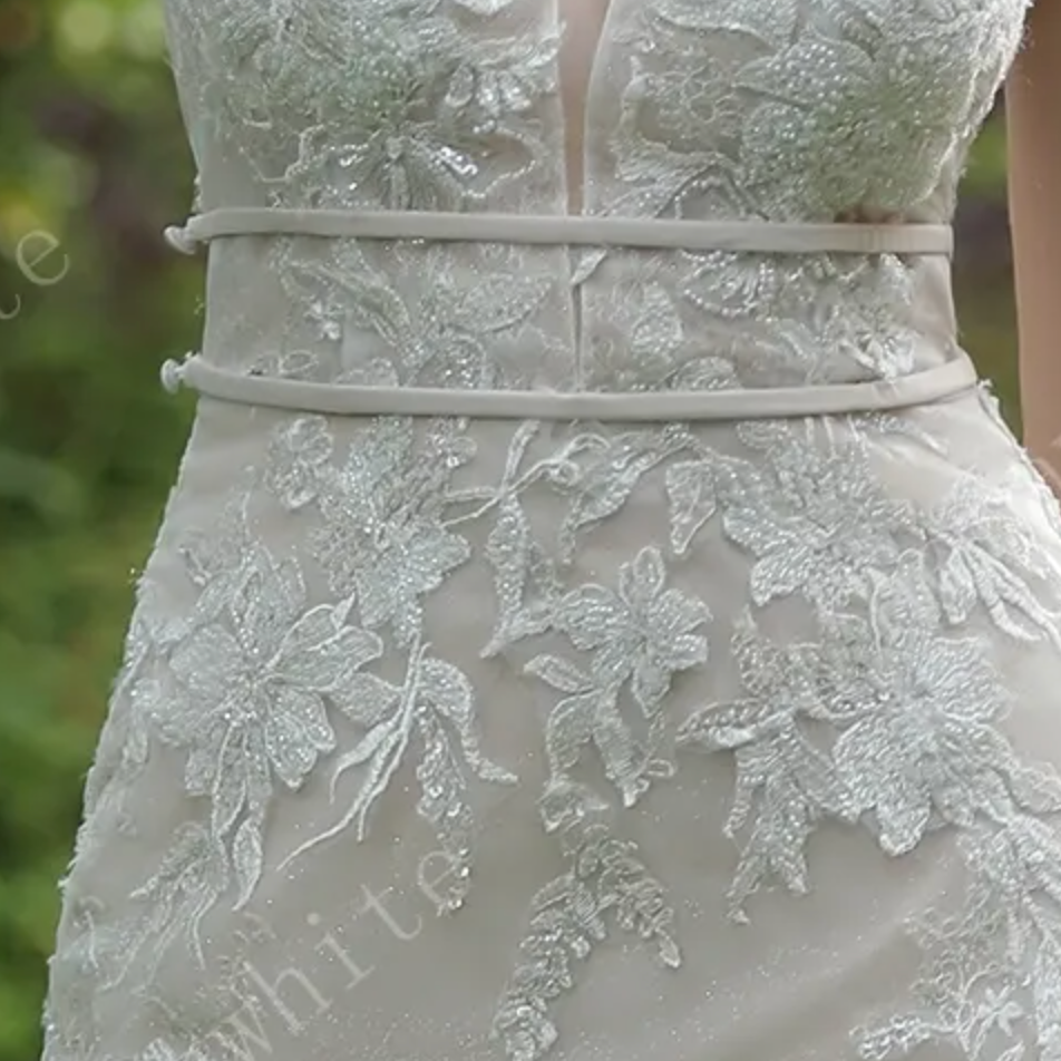 Wedding Dress Plunging Beaded Mermaid Gown With Double Band, Glistening with glamour, the bodice shimmers with a plunging sweetheart neckline and luxe lace that is adorned with crystal beading. A double banded waist cinches your curves and cascades to a mesmerizing mermaid silhouette in tulle.