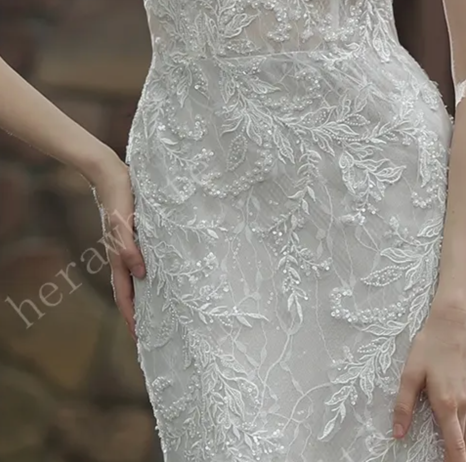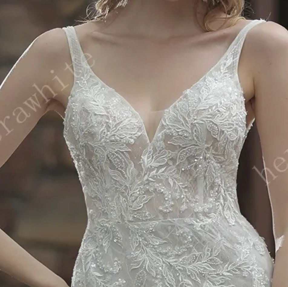 Wedding Dress V Neck Allover Lace Fit and Flare With Train, Fit and flare tulle lace mermaid wedding bridal gown featuring a V neckline, sleeveless bodice with delicate lace and beading accents, a slim fit with bottom flare out and a 29 inch train with zipper back closure. Available in ivory, ivory/pink or ivory/champagne (same as photos).
