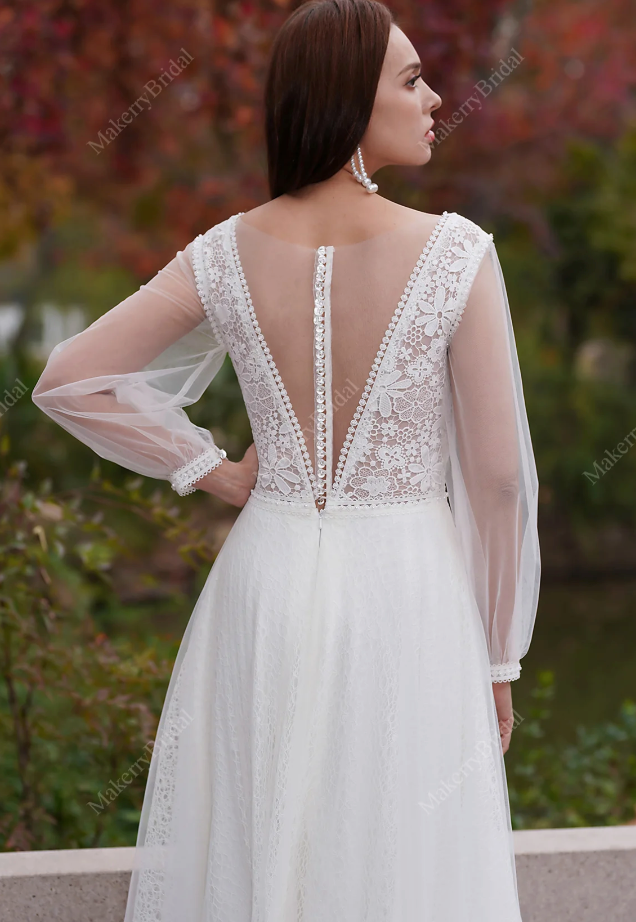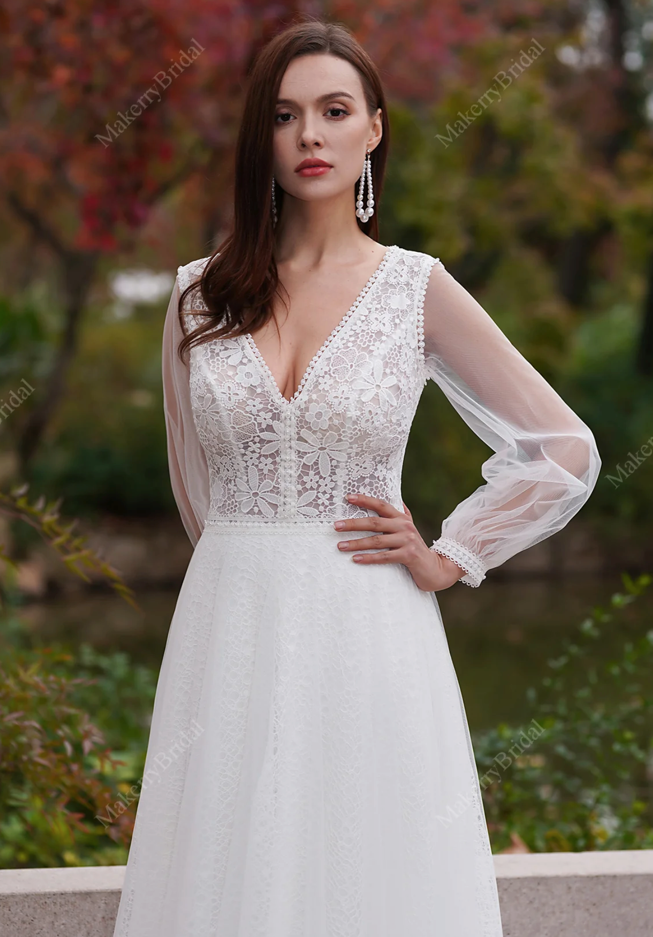 Wedding Dress Boho Lace With Long Sleeves And Lace Bridal Gown, with long sleeves features delicate beading and intricate embroidery reminiscent of a fairy tale. It is exceptionally lightweight and comfortable to wear. Displayed here in an elegant ivory-on-ivory color combination.