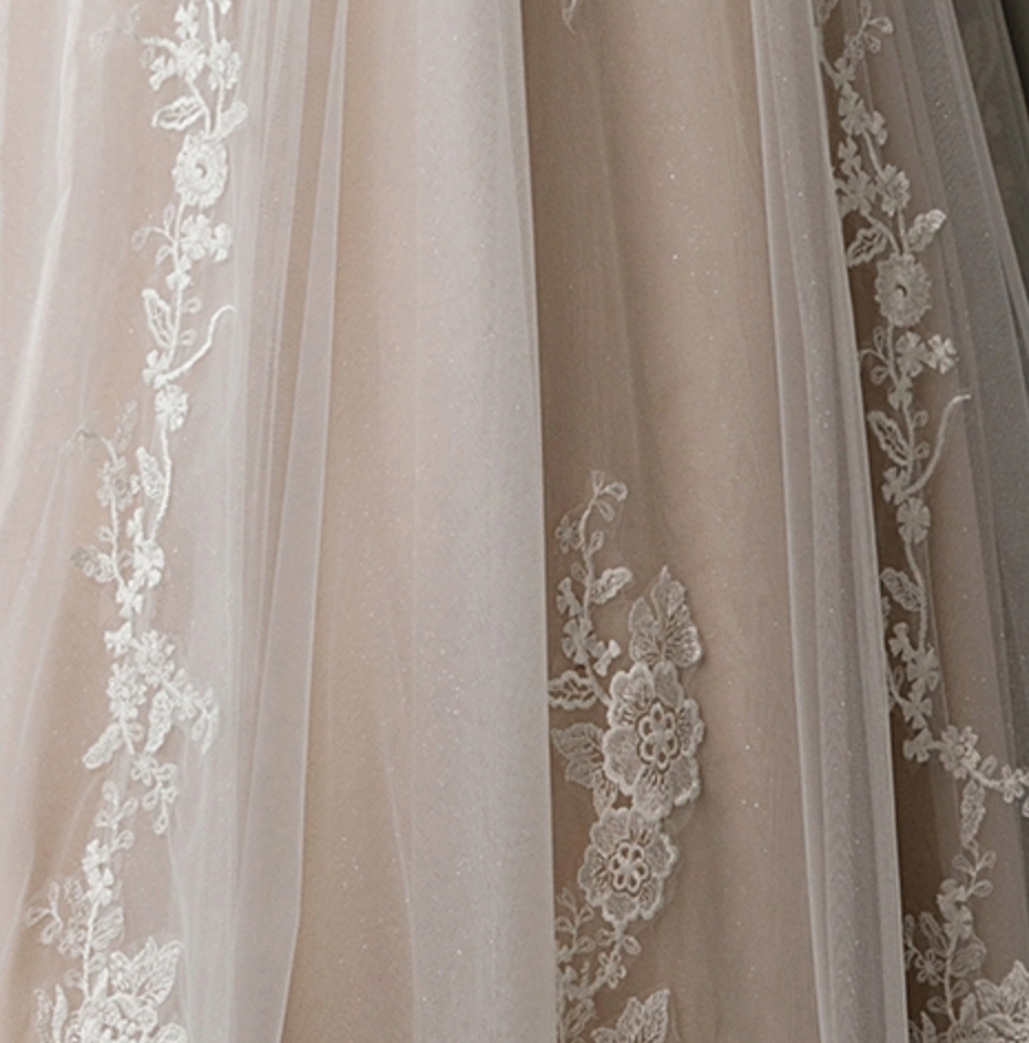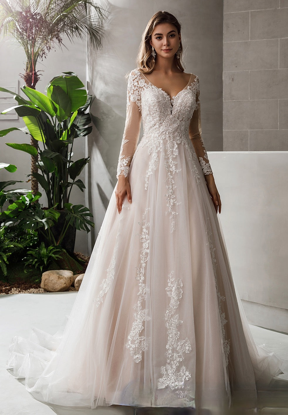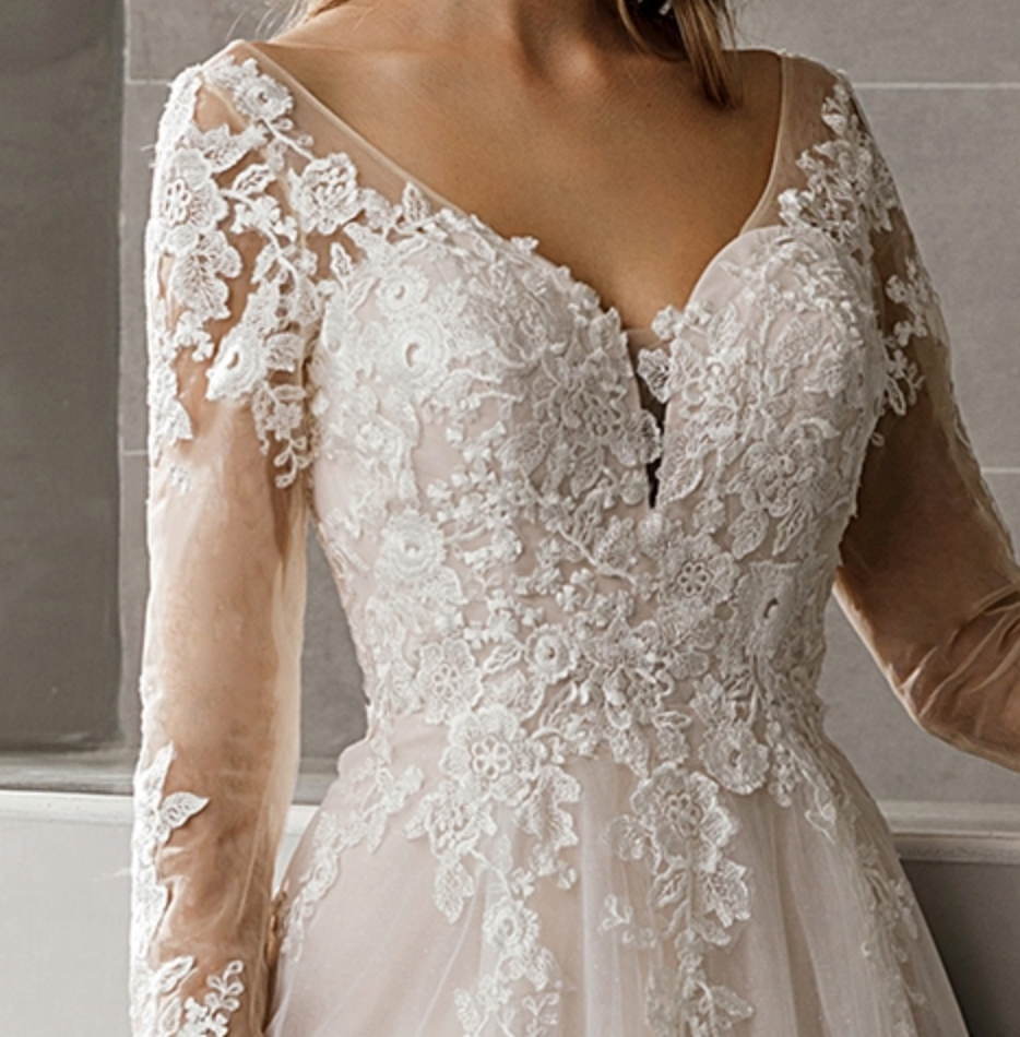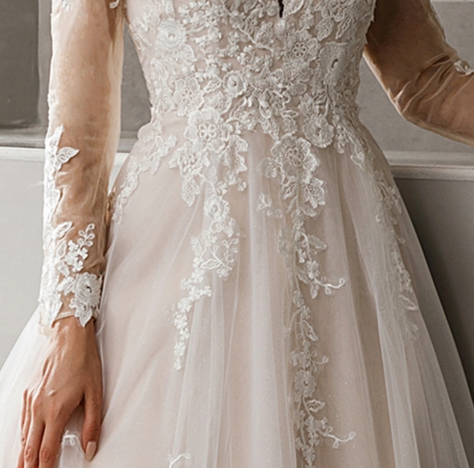 Wedding Dress Lace Satin A Line Bridal Gown With Glitter Tulle, Classic pink nude princess a-line gown with long, tattoo sleeves and an elegant V-neck bodice coated with cuts of fine lace flowers that trickle down the waistband and finish at the edges of a long, layered skirt in soft tulle. Dress shown in ivory/pink.