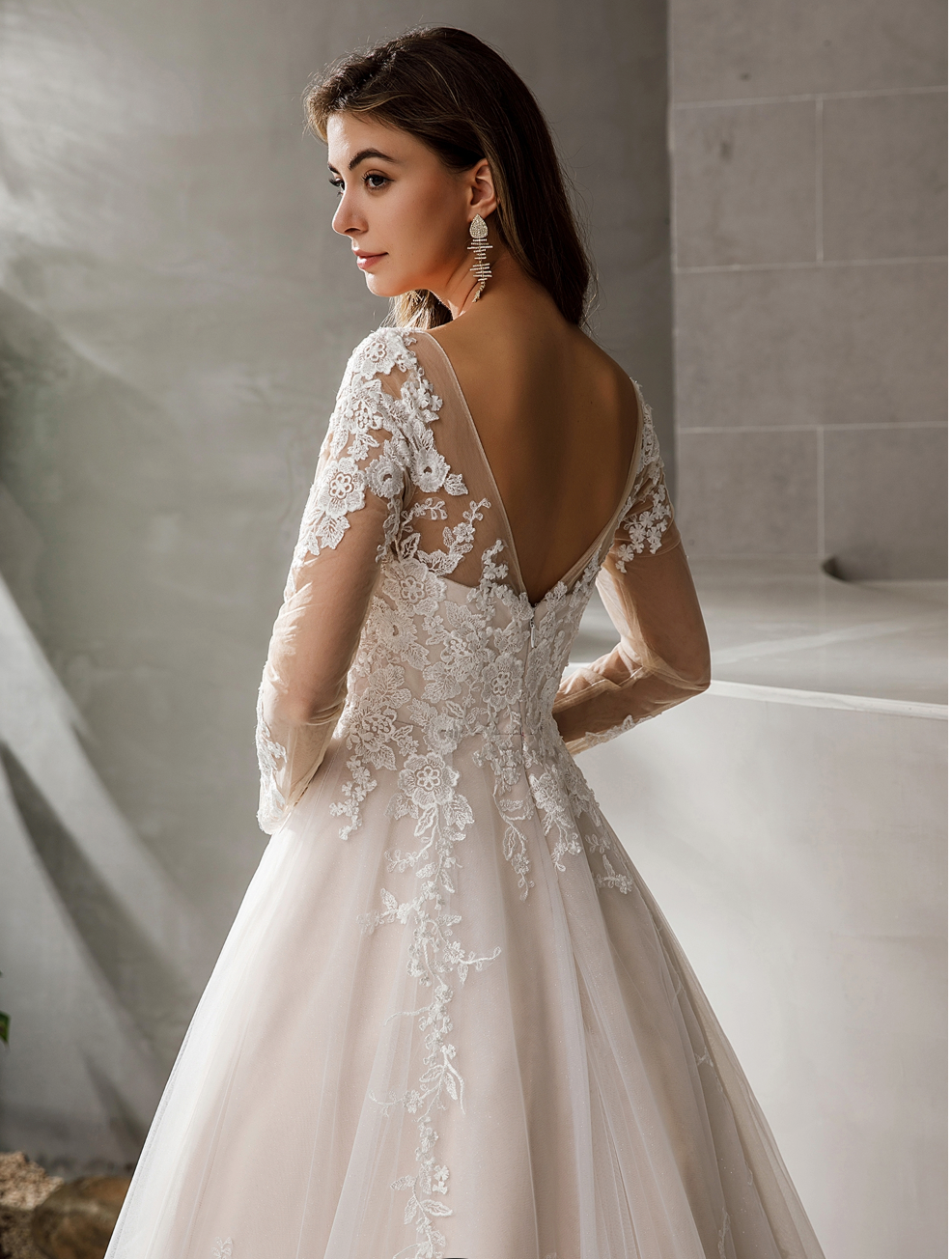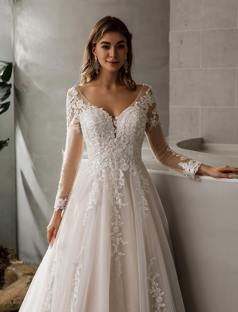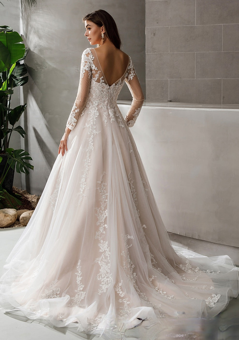 Wedding Dress Lace Satin A Line Bridal Gown With Glitter Tulle, Classic pink nude princess a-line gown with long, tattoo sleeves and an elegant V-neck bodice coated with cuts of fine lace flowers that trickle down the waistband and finish at the edges of a long, layered skirt in soft tulle. Dress shown in ivory/pink.