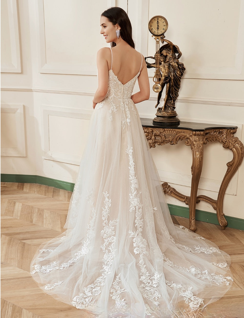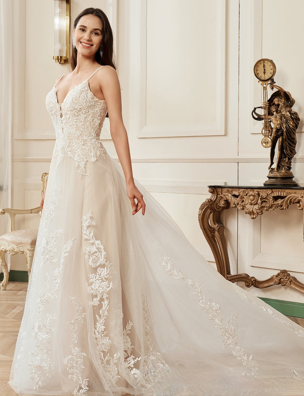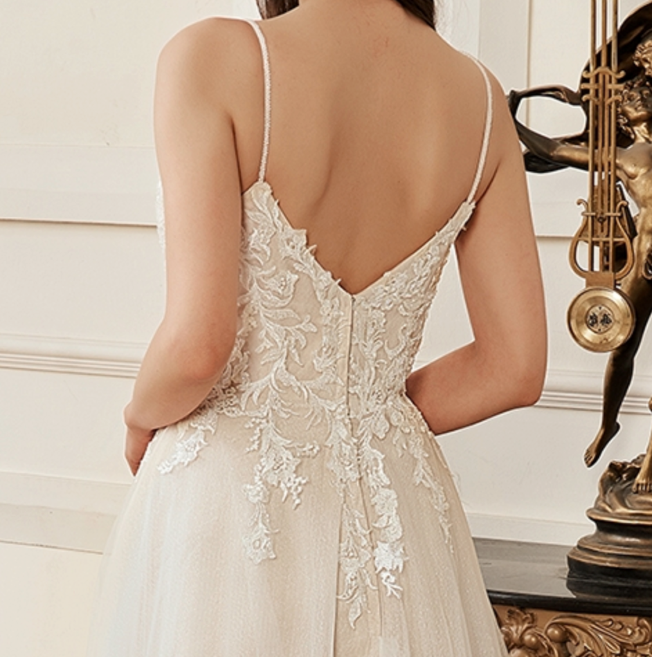 People ask about the risk of buying online and not being able to try on the dress. We recommend you go to a local bridal shop to try on wedding dress styles to find your dream dress style, then shop online for a wider selection and with better knowledge and understanding of what style dress looks best on you. Use the online model photos as a guide. Some models will be holding a dress out or the full train is spread out, this is to show the dress detail to the customer.