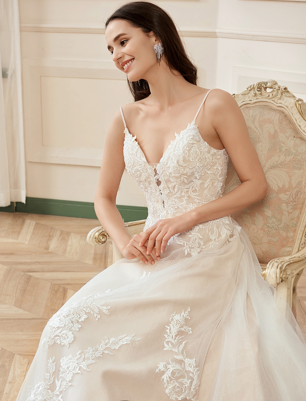 Wedding Dress Blush V-Neck Flower Lace A-Line Bridal Gown, Walk down the aisle all eyes will be on you in this blush gorgeous wedding dress featuring an illusion V-neck lace bodice adorned with delicate beaded flower lace and spaghetti strap extend to a V-back with zipper closure, flowing into a grand full skirt with an under layer of glitter tulle. Embroidered lace softly spills down the skirt to a sheer court train for a subtle sparkle. Dress shown in ivory/pink