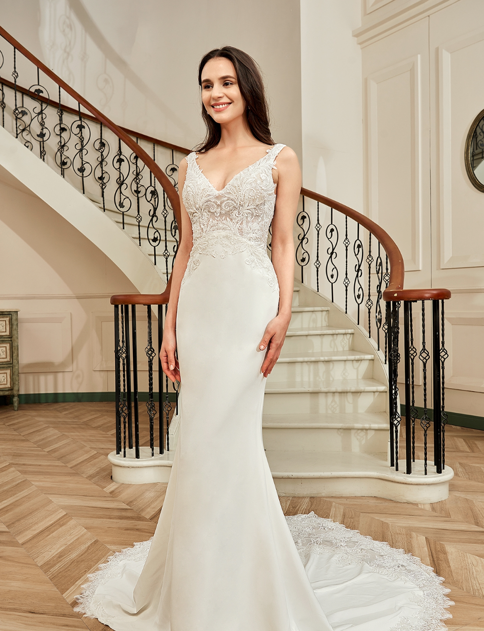Wedding Dress Crepe Sheath Shaped Court Lace Train Gown, This designer sheath wedding dress features a V-neckline over Illusion lace bodice, chic lace motifs falling softly onto the slim stretch crepe skirt, completed with wide hemline lace edging with sheer, shaped train in court length, also available in white.