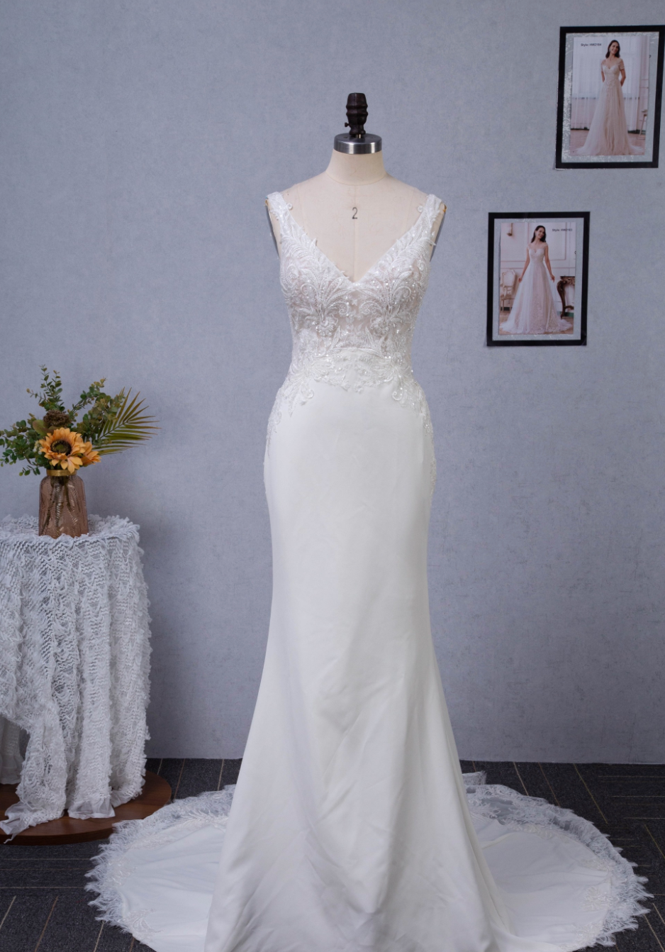 Wedding Dress Crepe Sheath Shaped Court Lace Train Gown