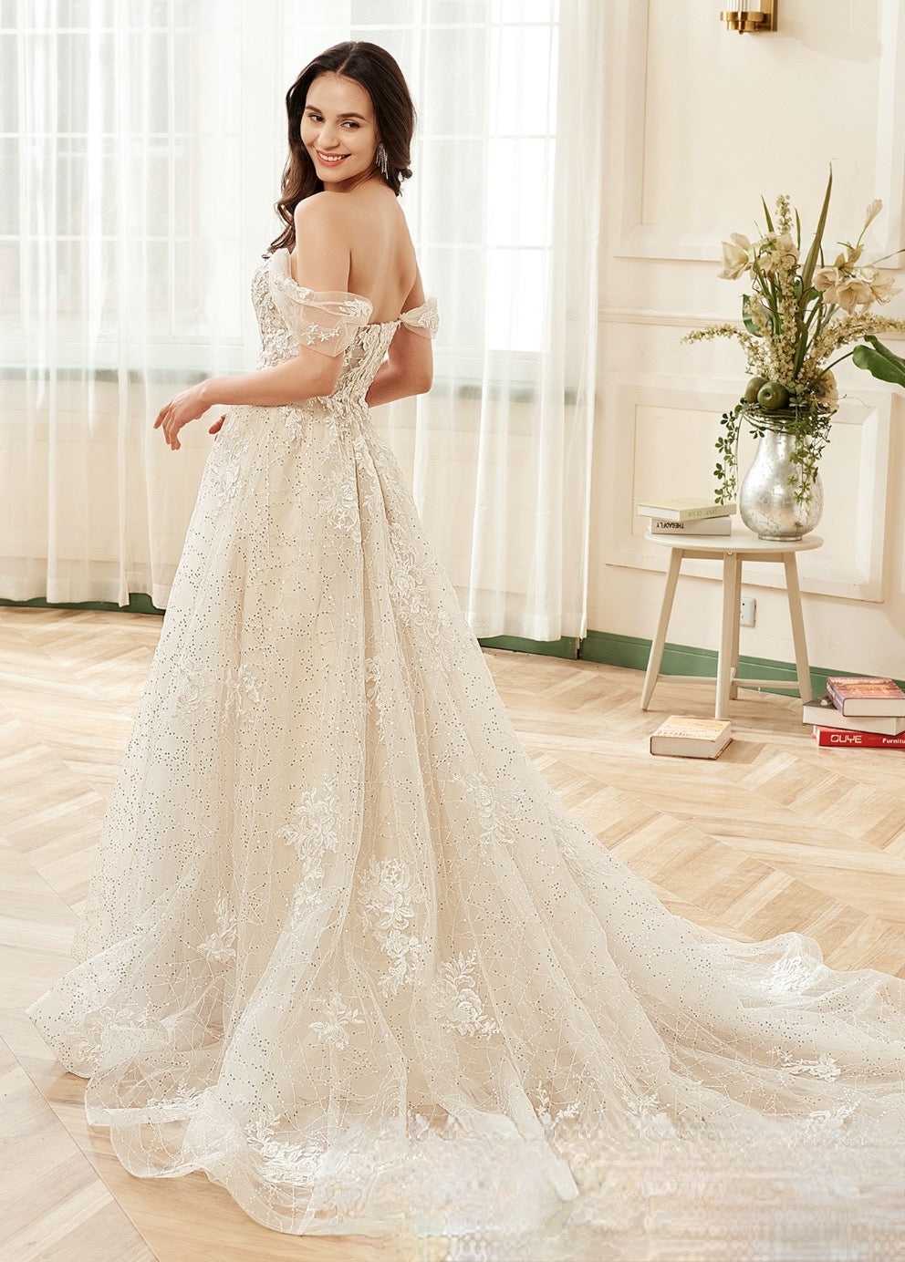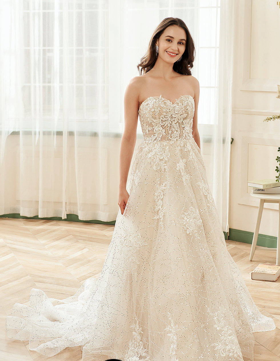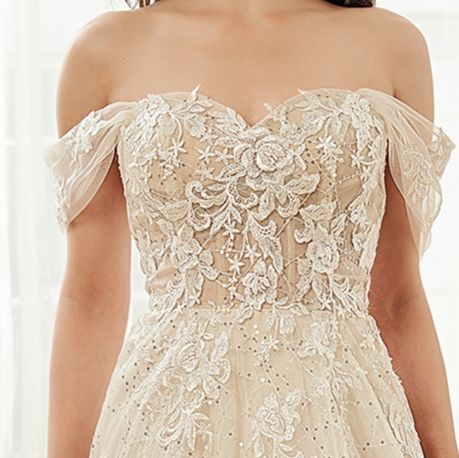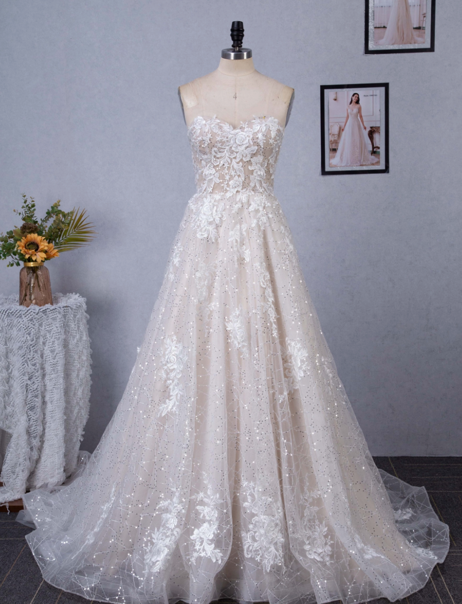 Wedding Dress Floral Lace Sequin Tulle Detachable Straps, Sweet and playful, this strapless wedding dress features illusion lace sweetheart unlined bodice with detachable off-the-shoulder straps. Embellished with scattered floral lace appliques and sequined tulle creates all over sparkle. Dress shown in ivory/champagne